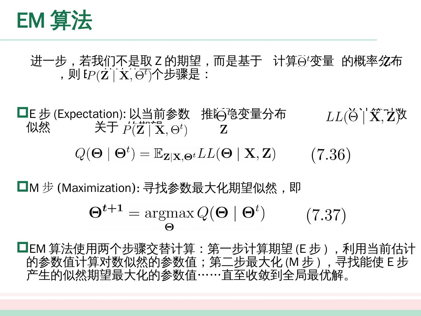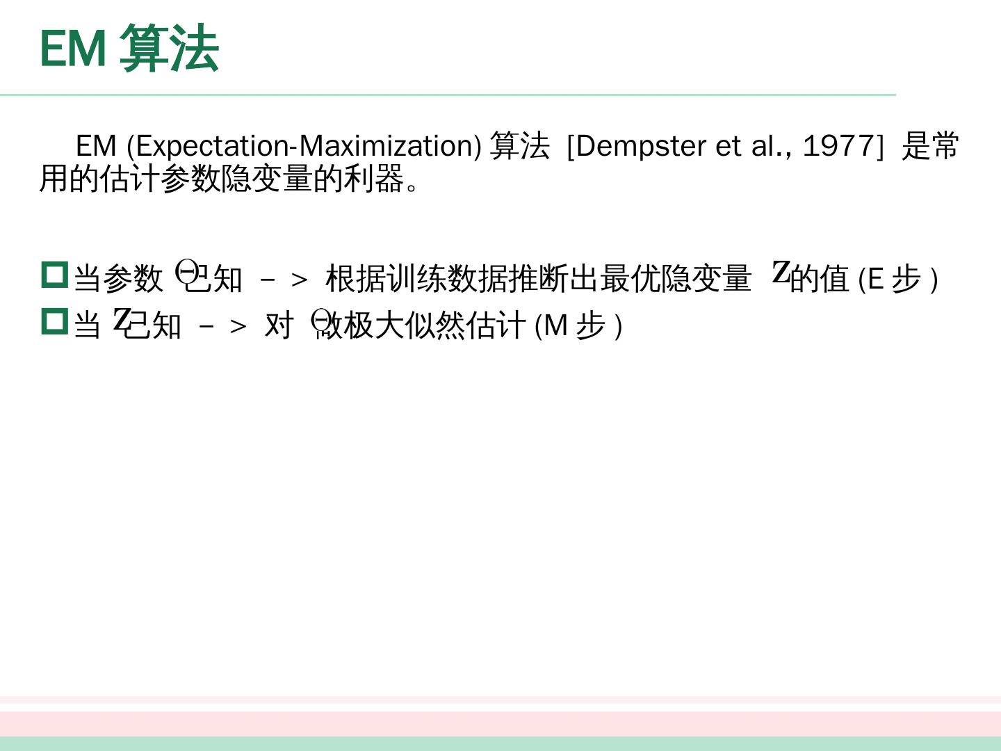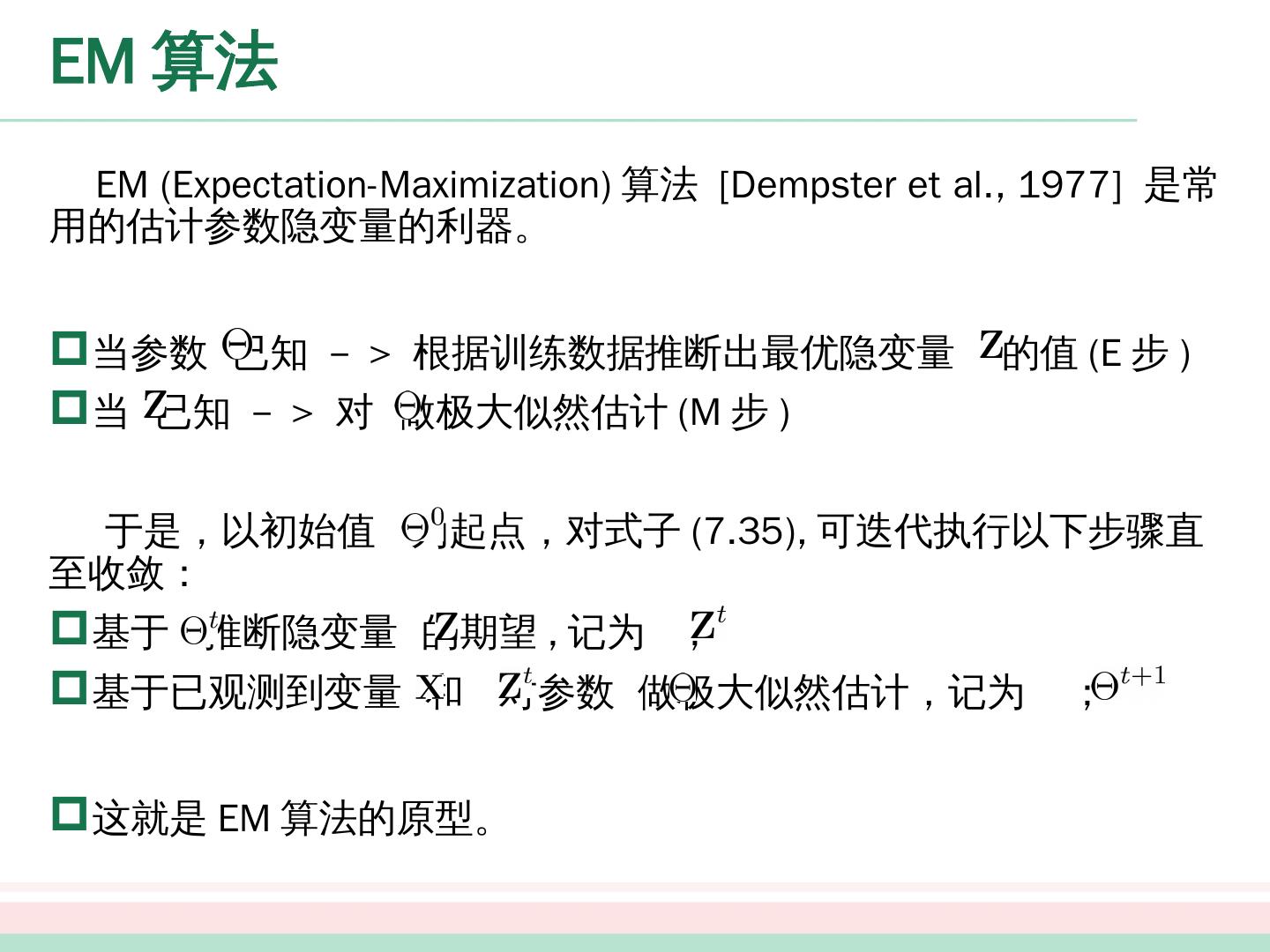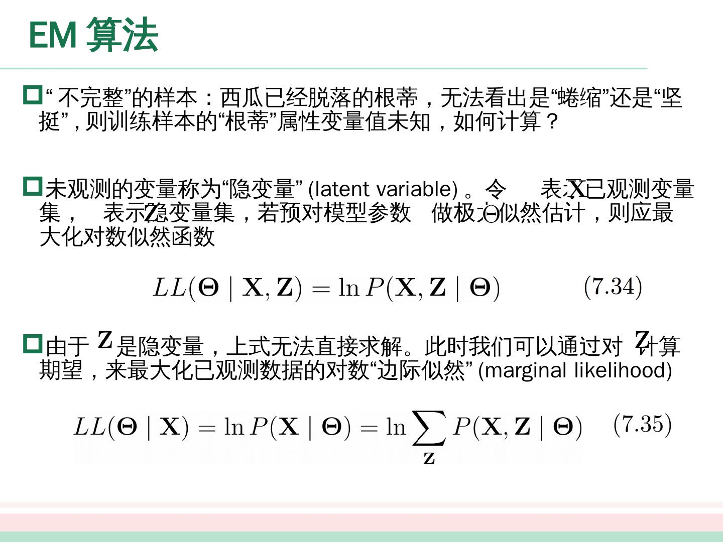 24 .极大似然估计 例如,在连续属性情形下,假设概率密度函数 ,则参数 和 的极大似然估计为 也就是说,通过极大似然法得到的正态分布均值就是样本均值,方差就是 的均值,这显然是一个符合直觉的结果。 需注意的是,这种参数化的方法虽能使类条件概率估计变得相对简单,但估计结果的准确性严重依赖于所假设的概率分布形式是否符合潜在的真实数据分布。