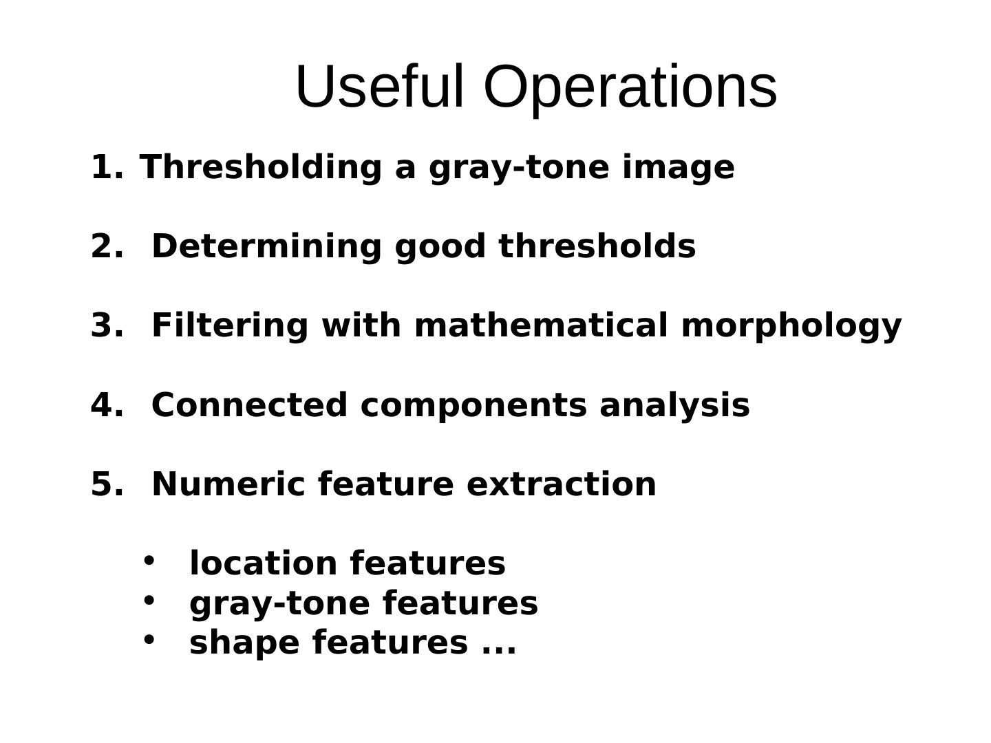 3 . Useful Operations 1. Thresholding a gray-tone image 2. Determining good thresholds 3. Filtering with mathematical morphology 4. Connected components analysis 5. Numeric feature extraction • location features • gray-tone features • shape features ...