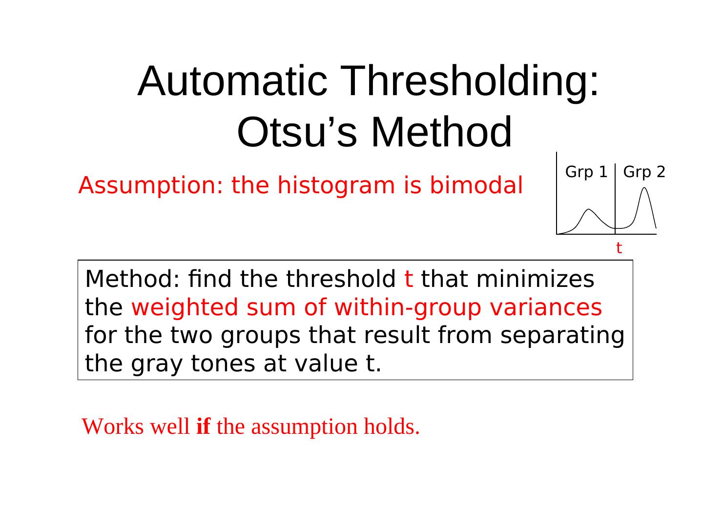 5 . Automatic Thresholding: Otsu’s Method Grp 1 Grp 2 Assumption: the histogram is bimodal t Method: find the threshold t that minimizes the weighted sum of within-group variances for the two groups that result from separating the gray tones at value t. Works well if the assumption holds.