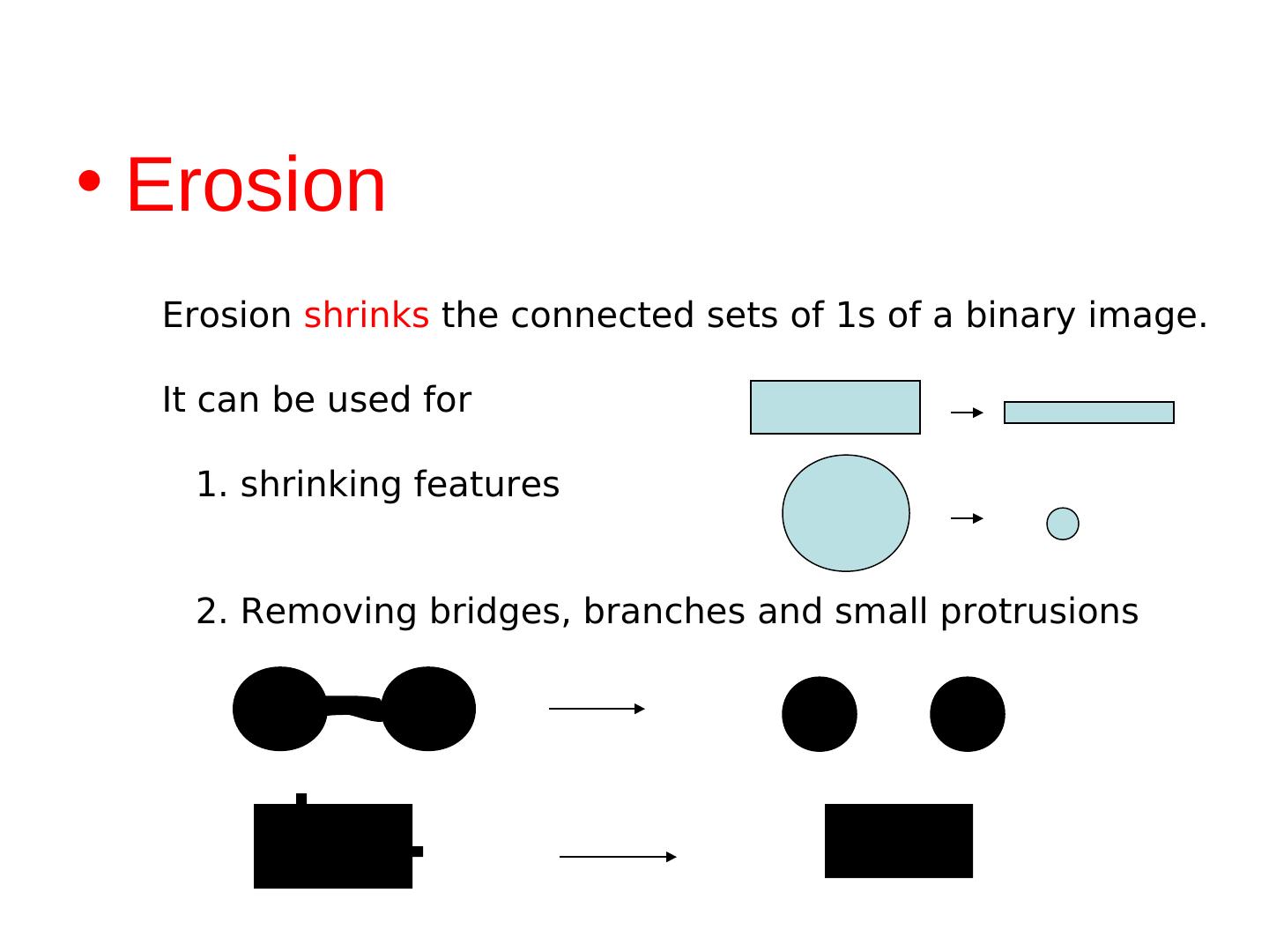 8 .• Erosion Erosion shrinks the connected sets of 1s of a binary image. It can be used for 1. shrinking features 2. Removing bridges, branches and small protrusions