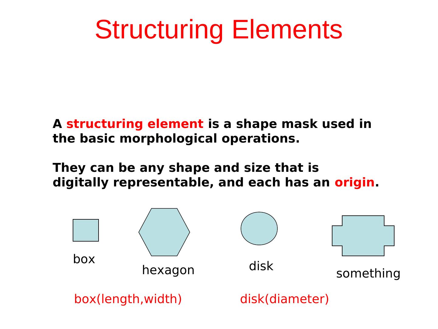 9 . Structuring Elements A structuring element is a shape mask used in the basic morphological operations. They can be any shape and size that is digitally representable, and each has an origin. box hexagon disk something box(length,width) disk(diameter)
