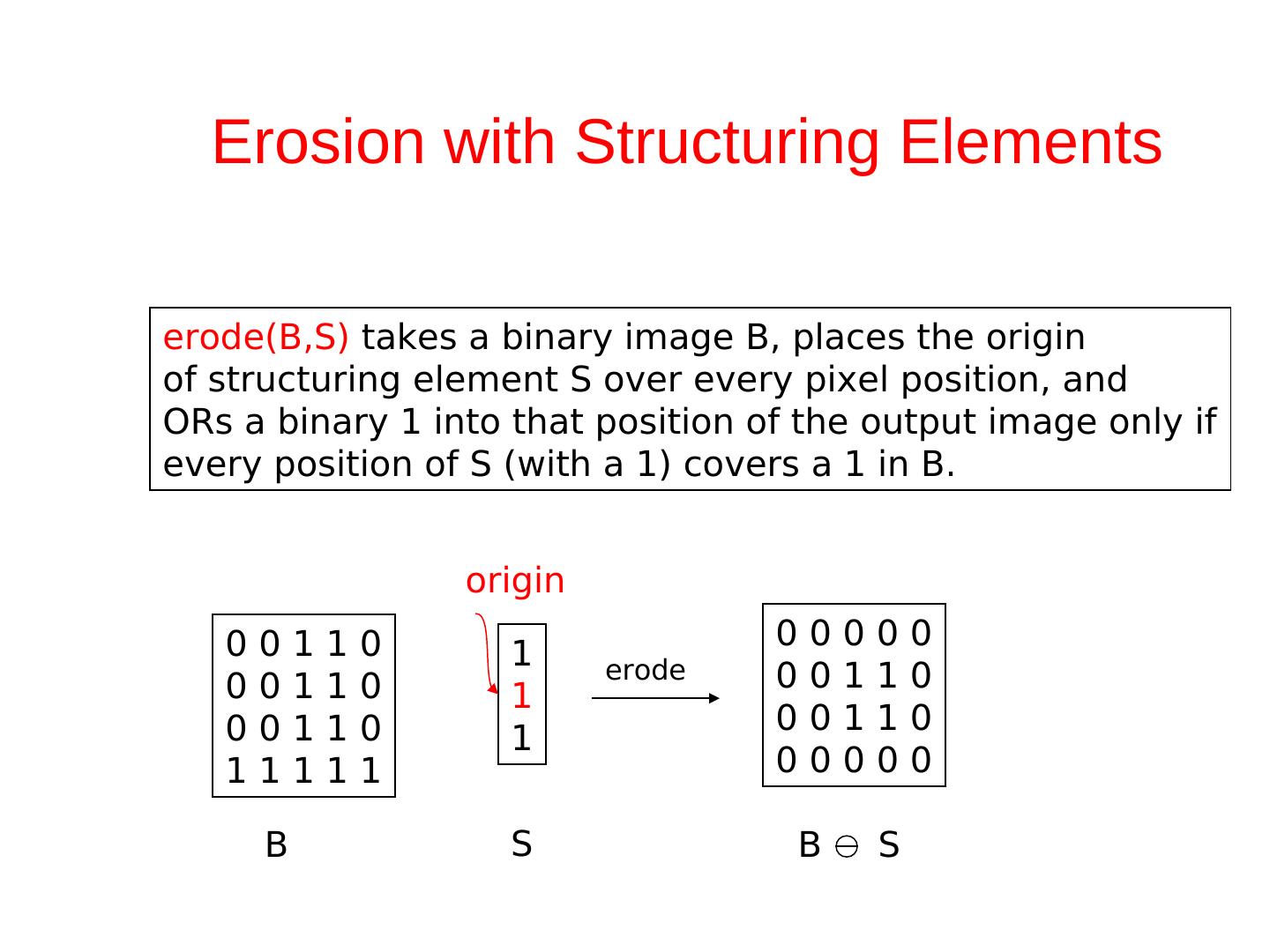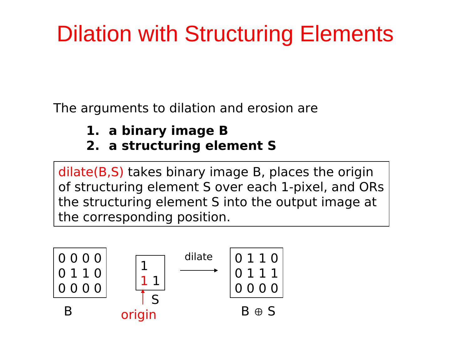 10 .Dilation with Structuring Elements The arguments to dilation and erosion are 1. a binary image B 2. a structuring element S dilate(B,S) takes binary image B, places the origin of structuring element S over each 1-pixel, and ORs the structuring element S into the output image at the corresponding position. 0000 dilate 0110 1 0110 0111 11 0000 0000 S B origin BS