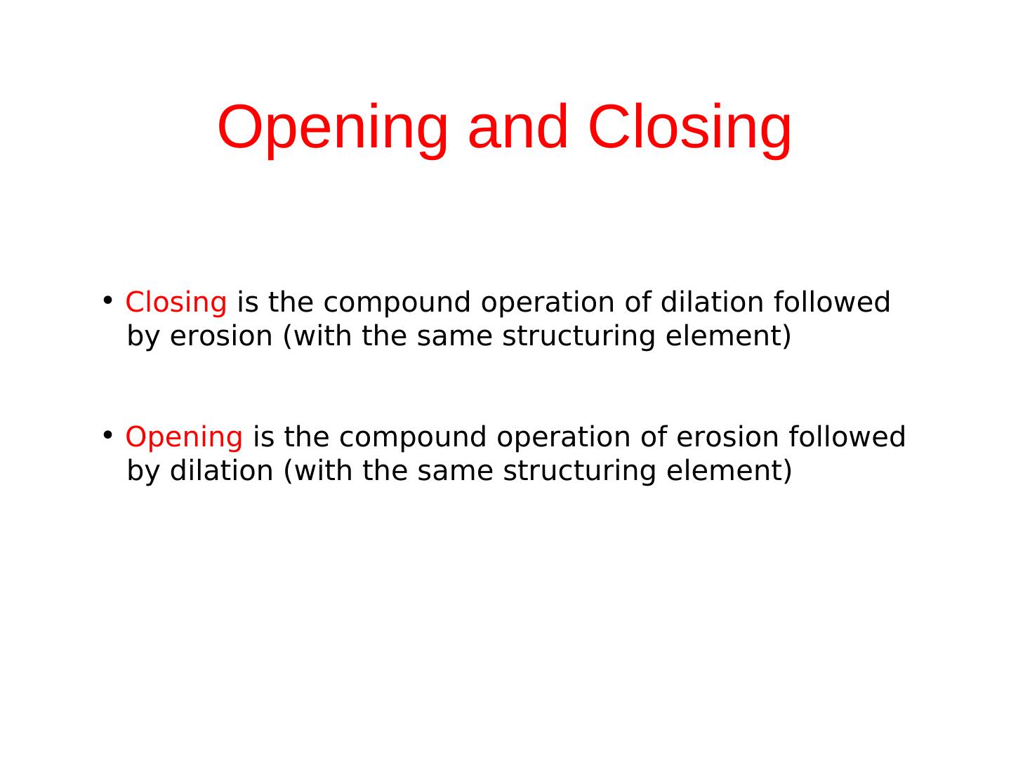 12 . Opening and Closing • Closing is the compound operation of dilation followed by erosion (with the same structuring element) • Opening is the compound operation of erosion followed by dilation (with the same structuring element)
