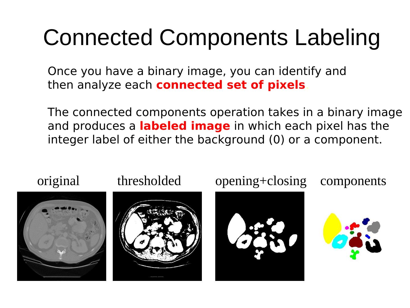15 . Connected Components Labeling Once you have a binary image, you can identify and then analyze each connected set of pixels. The connected components operation takes in a binary image and produces a labeled image in which each pixel has the integer label of either the background (0) or a component. original thresholded opening+closing components