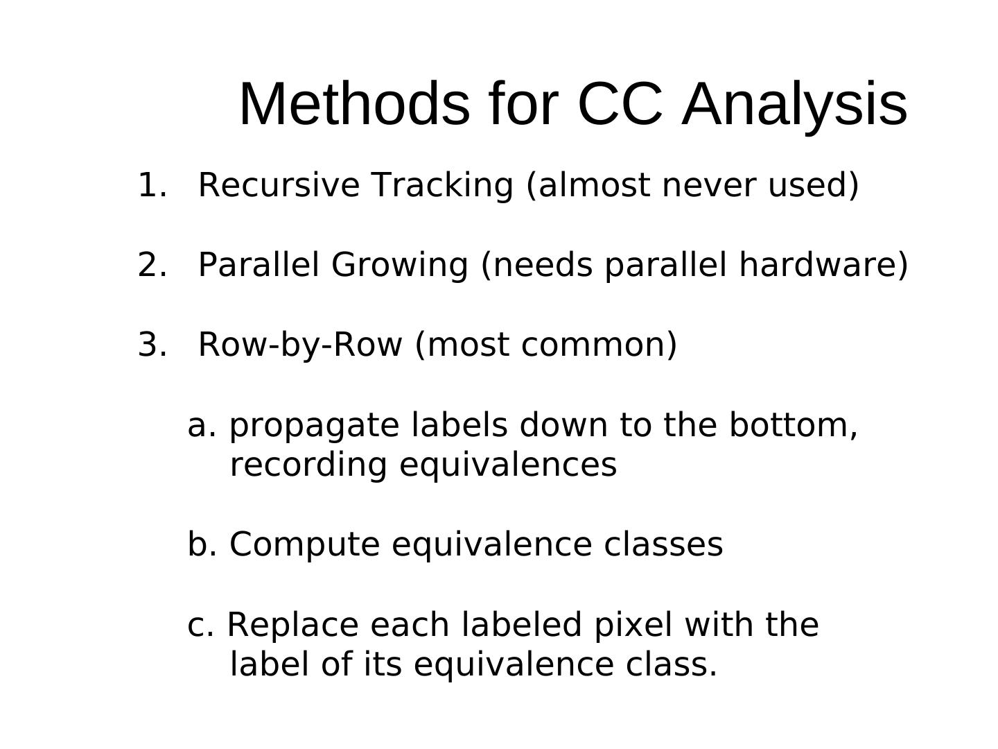 16 . Methods for CC Analysis 1. Recursive Tracking (almost never used) 2. Parallel Growing (needs parallel hardware) 3. Row-by-Row (most common) a. propagate labels down to the bottom, recording equivalences b. Compute equivalence classes c. Replace each labeled pixel with the label of its equivalence class.