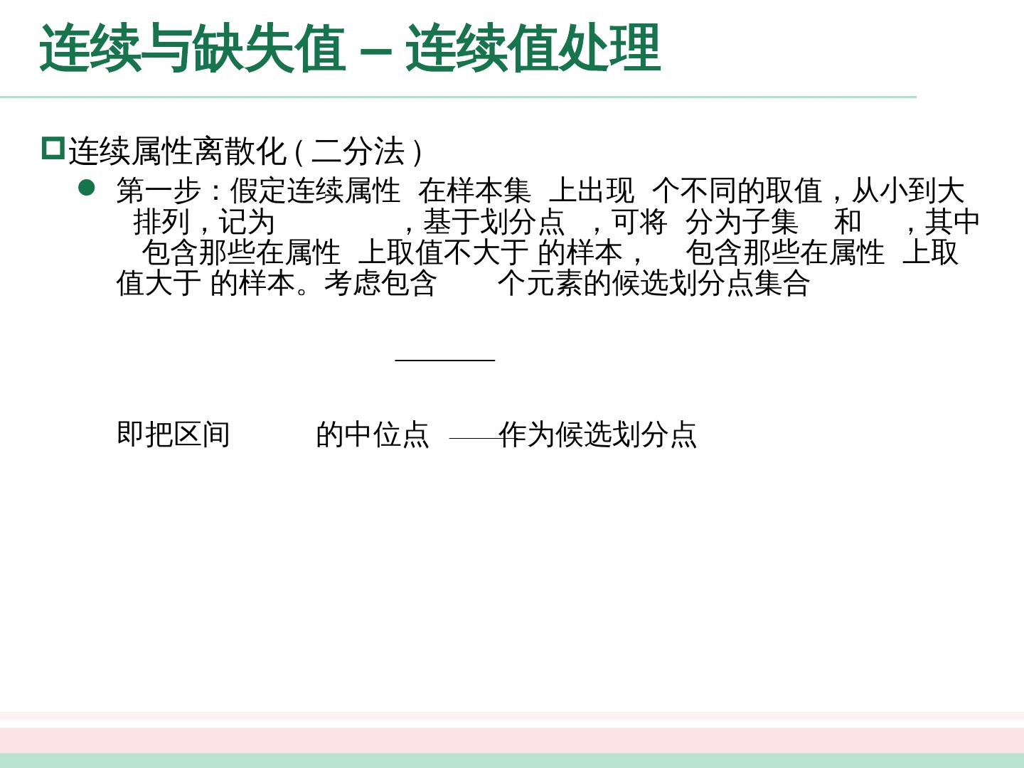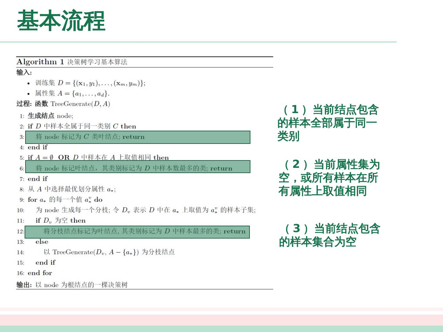 7 .基本流程 ( 1 ) 当前结点 包含 的样本全部属于同一类别 ( 2 )当前属性集为空,或所有样本在所有属性上取值相同 ( 3 )当前结点包含的样本集合为空