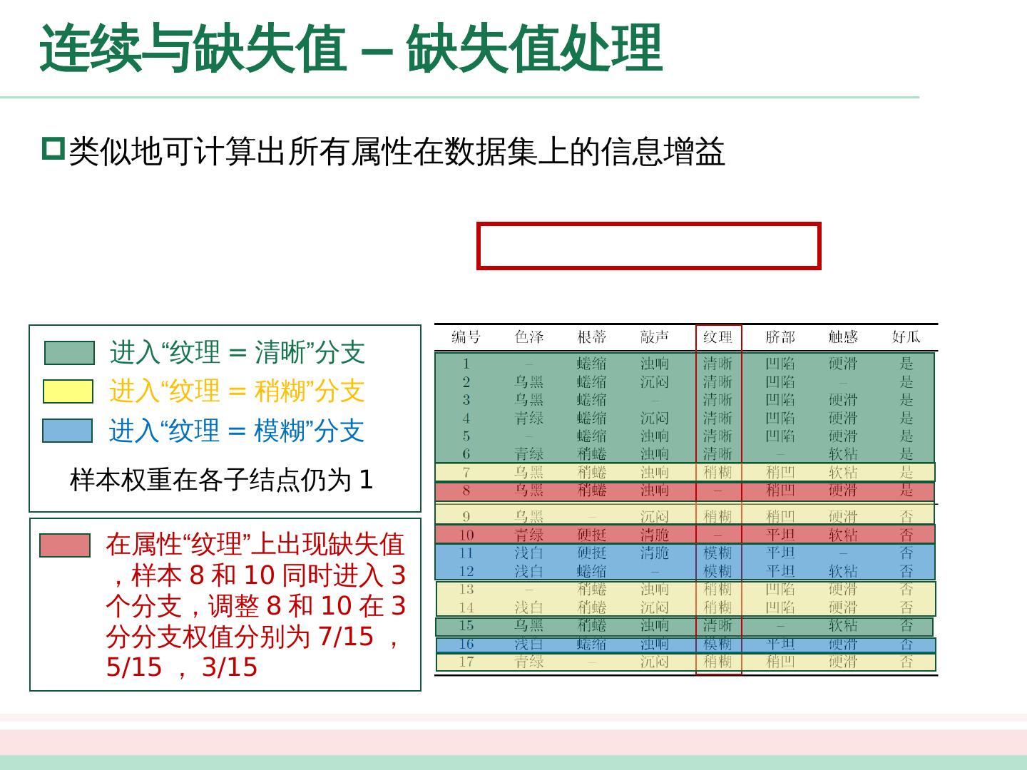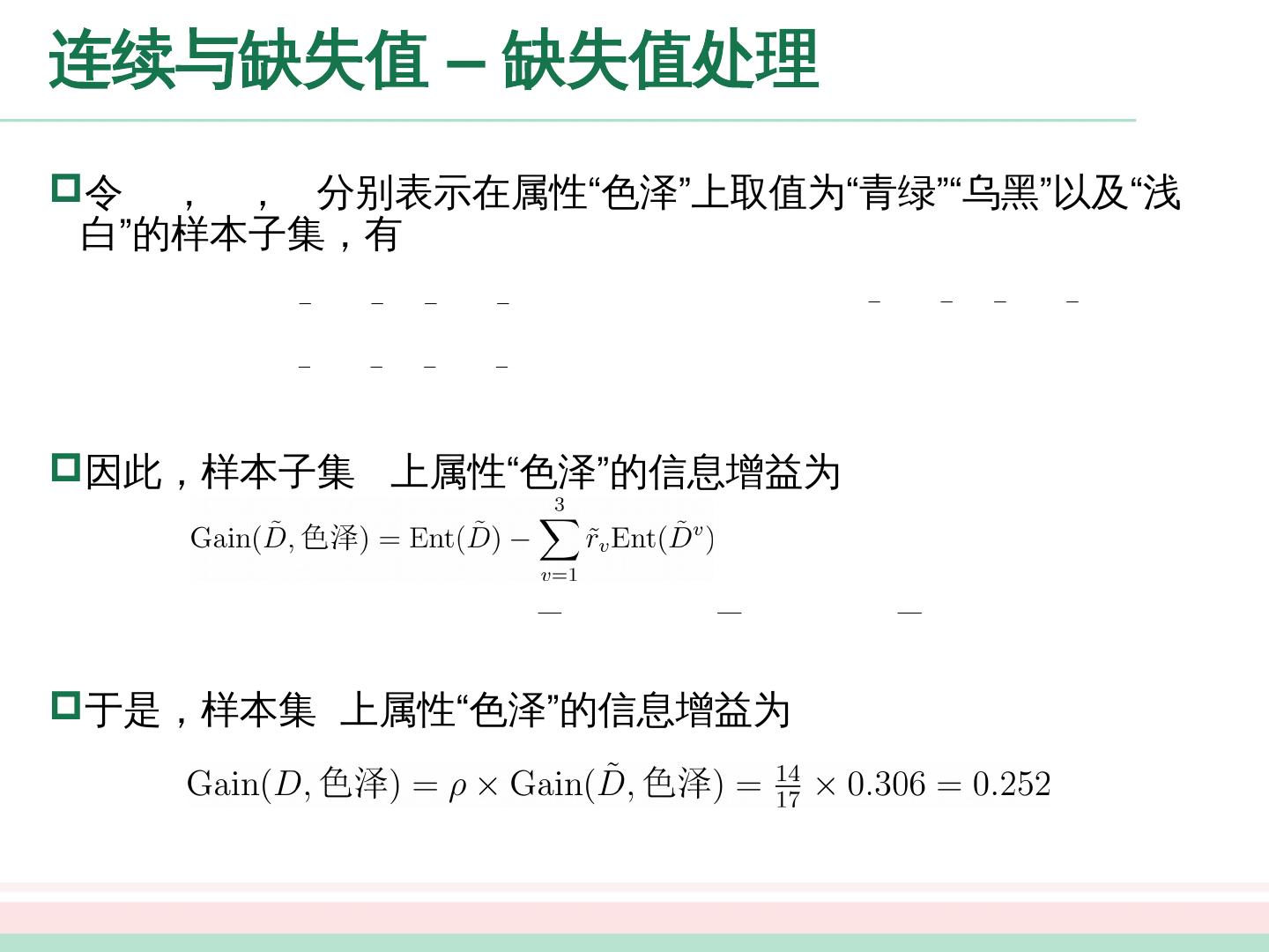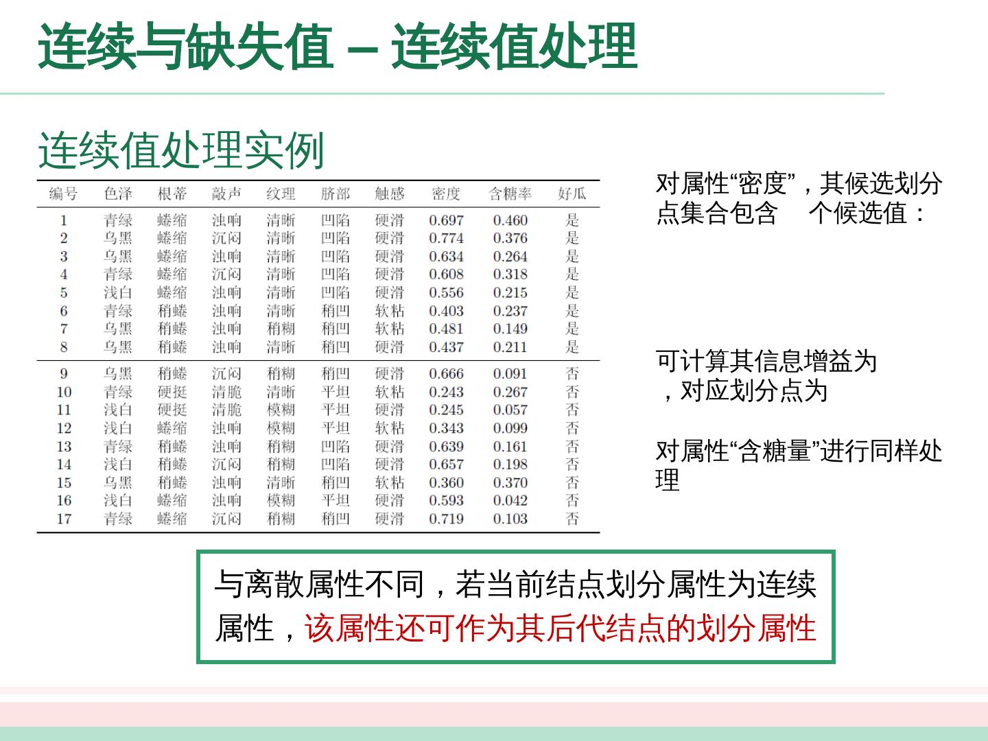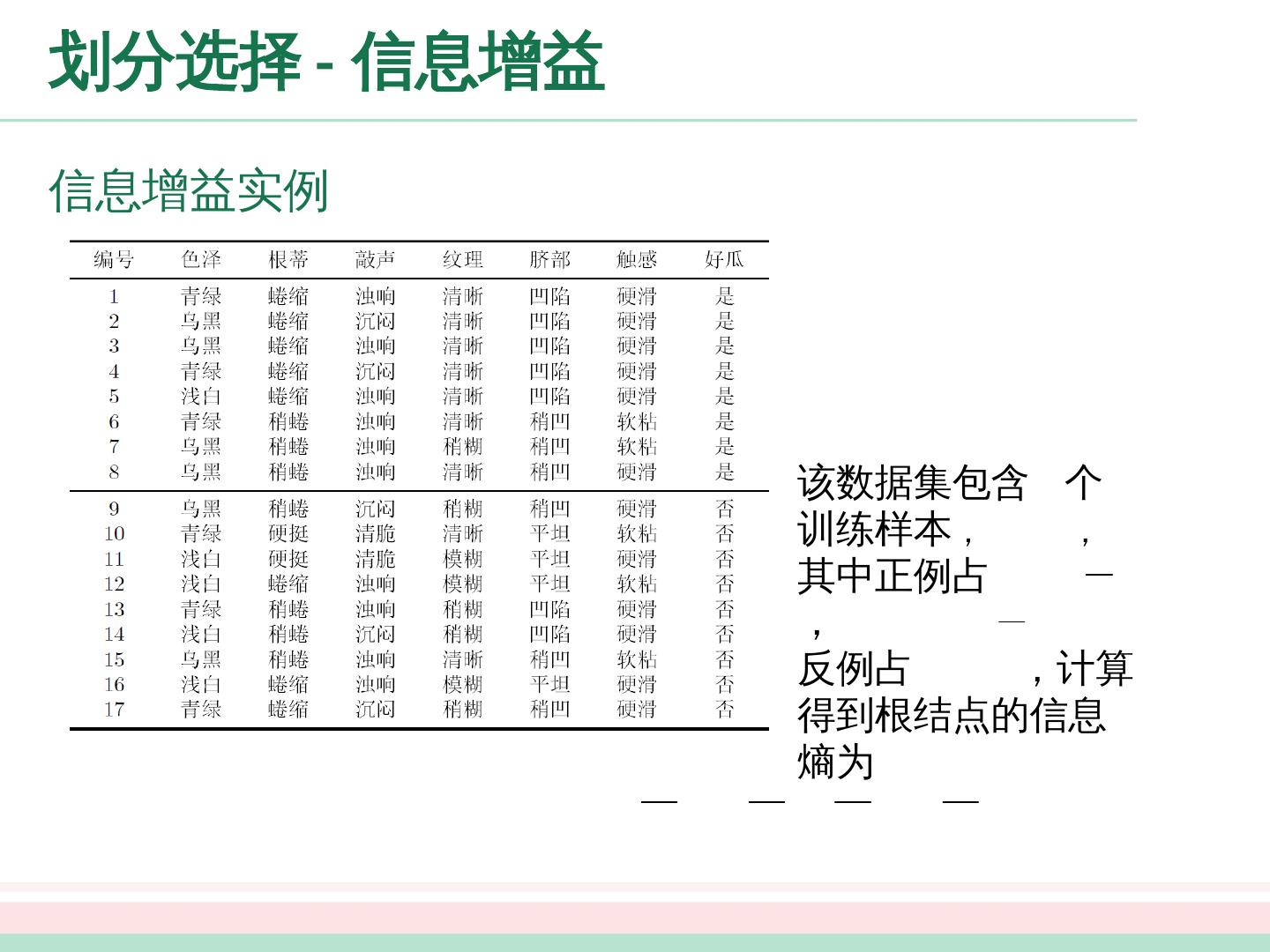 12 .划分选择 - 信息增益 以属性“色泽”为例,其对应的 个数据子集分别为 ( 色泽 = 青绿 ) , ( 色泽 = 乌黑 ) , ( 色泽 = 浅白 ) 子集 包含编号为 的 个样例,其中正例占 ,反例占 , 、 同理, 个结点的信息熵为: 属性 “色泽”的 信息增益为