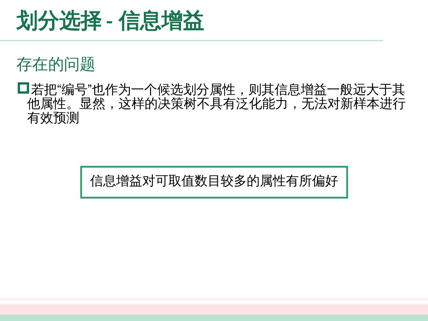 15 .划分选择 - 信息增益 存在的问题 若把“编号”也作为一个候选划分属性,则其信息增益一般远大于其他属性。显然,这样的决策树不具有泛化能力,无法对新样本进行有效预测 信息增益对 可取值数目较多的属性有所 偏好