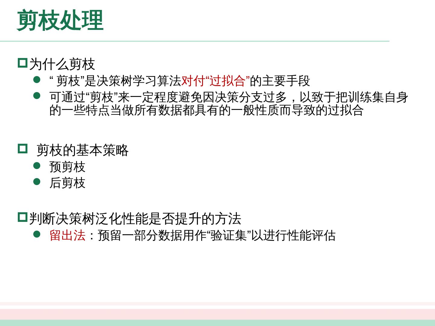 19 .剪枝处理 为什么剪枝 “剪枝”是 决策树学习算法 对付“过拟合” 的 主要 手段 可通过“剪枝”来一定程度避免因决策分支过多,以致于把训练集自身的一些特点当做所有数据都具有的一般性质而导致的过 拟合 剪枝的基本策略 预剪枝 后 剪枝 判断决策树泛化性能是否提升的方法 留 出法 :预留一部分数据用作“验证集”以进行性能评估