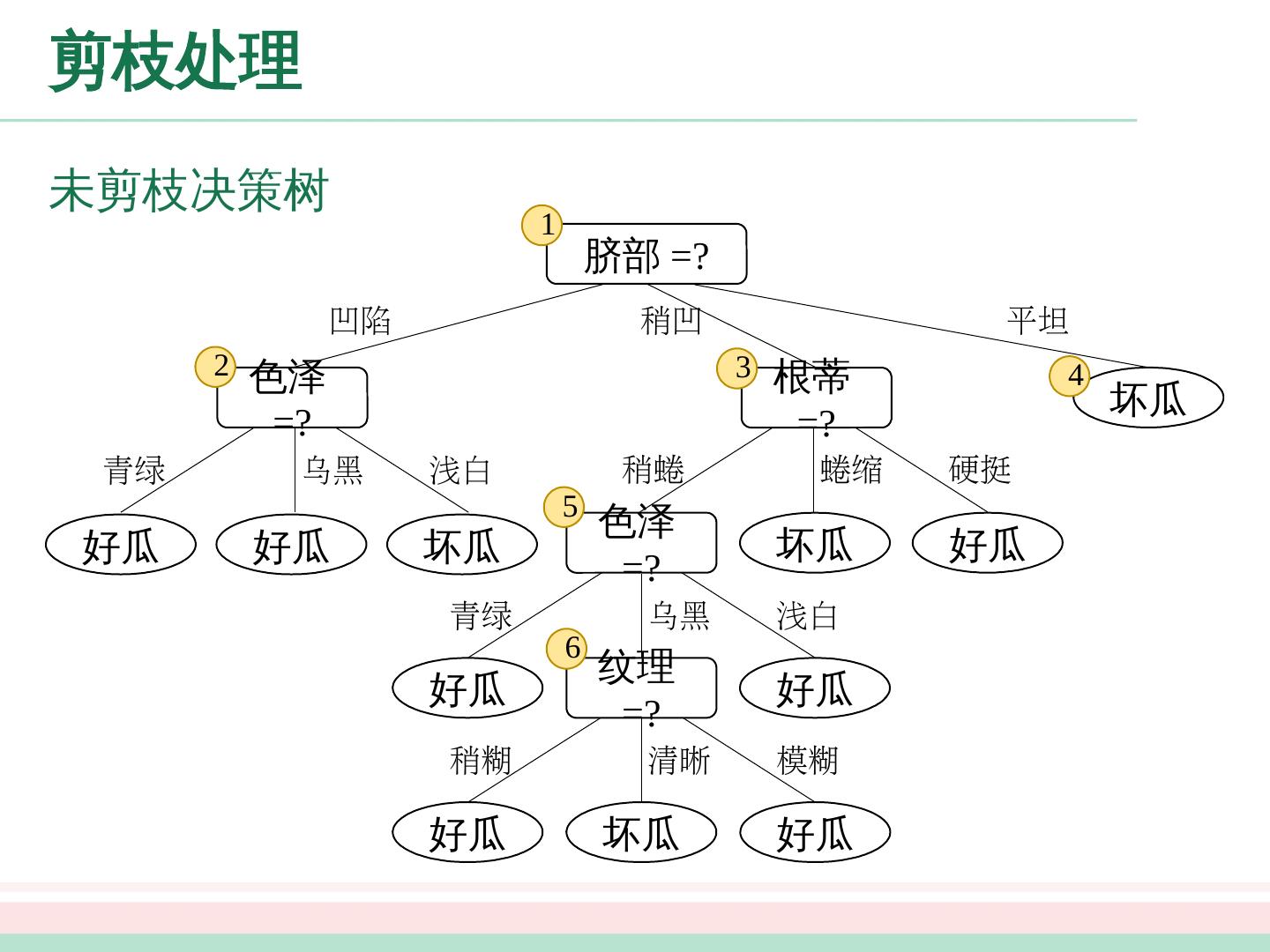 21 .剪枝处理 未剪枝决策树 好瓜 坏瓜 好瓜 清晰 纹理 =? 模糊 稍糊 好瓜 好瓜 乌黑 浅白 青绿 色泽 =? 坏 瓜 好瓜 蜷缩 硬挺 稍蜷 根蒂 =? 好瓜 坏瓜 好瓜 乌黑 浅白 青绿 色泽 =? 坏 瓜 脐部 =? 平坦 稍凹 凹陷 1 2 3 4 5 6