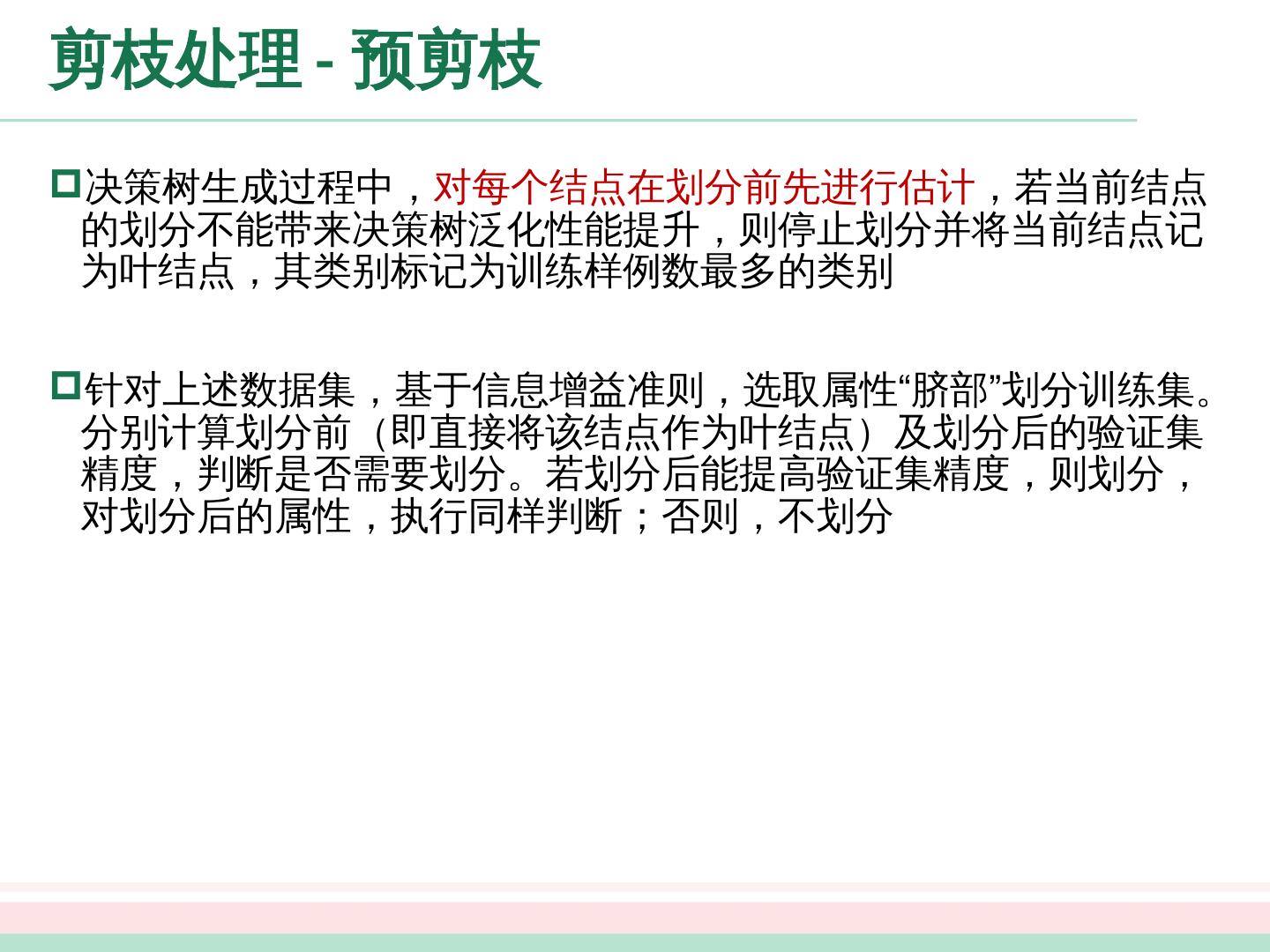 22 .剪枝处理 - 预剪枝 决策树生成过程 中 , 对 每个结点在 划分前先进行估计 , 若 当前结点的划分不能带来决策树泛化性能提升,则停止划分并将当前结点记为 叶结点,其类别标记为训练样例数最多的类别 针对上述数据集,基于 信息增益准则,选取属性“脐部”划分训练集。分别计算划分 前(即 直接将该结点作为叶 结点)及划分 后的验证集精度,判断是否需要划分。若划分 后能 提高验证集精度,则划分,对划分后的属性,执行同样 判断;否则,不划分