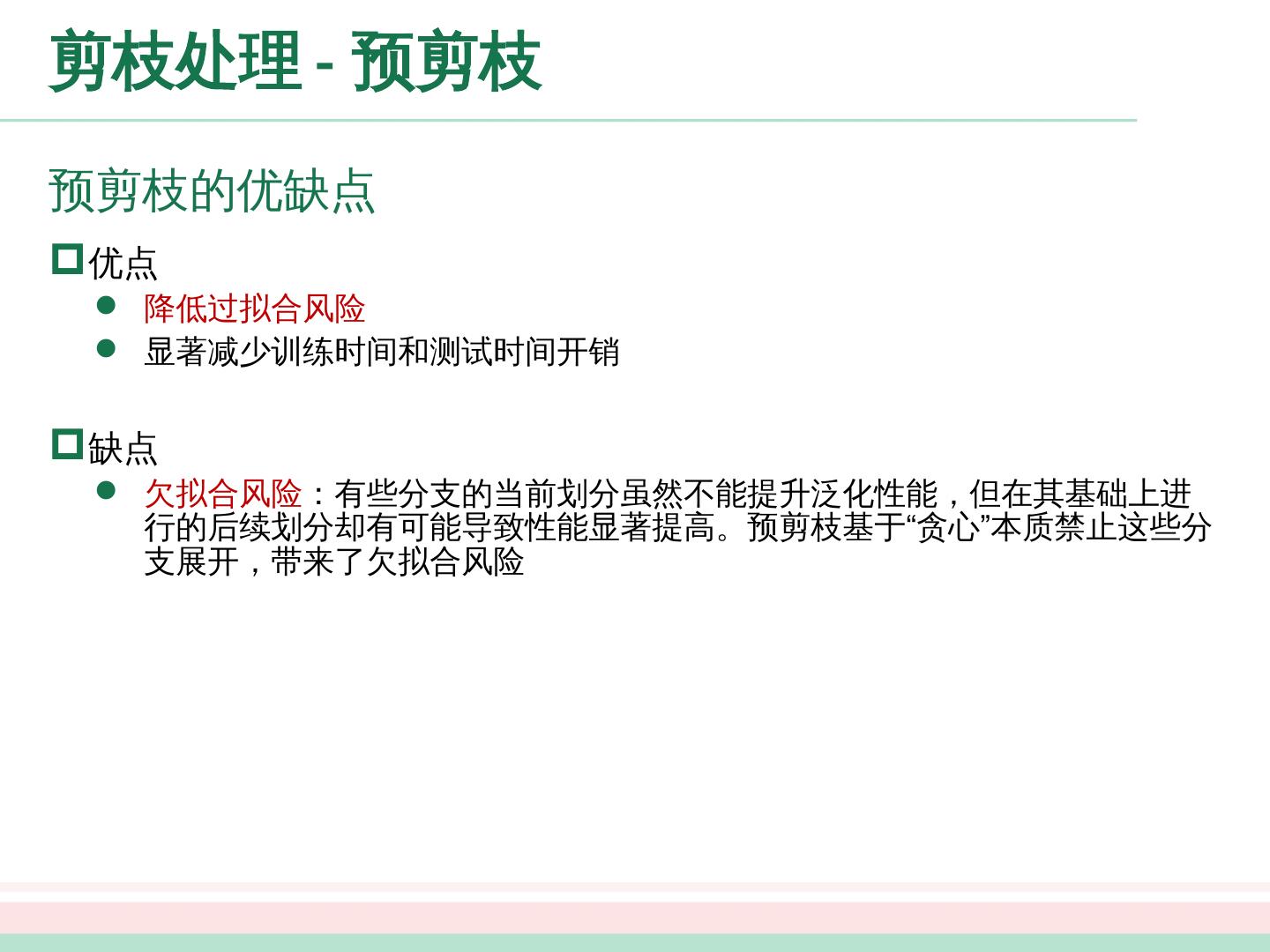 26 .剪枝处理 - 预剪枝 预剪枝的优缺点 优点 降低过拟合风险 显著减少训练时间和测试时间开销 缺点 欠拟合风险 :有些分支的当前划分虽然不能提升泛化性能,但在其基础上进行的后续划分却有可能导致性能显著提高。预剪枝基于“贪心”本质禁止这些分支展开,带来了欠拟合风险