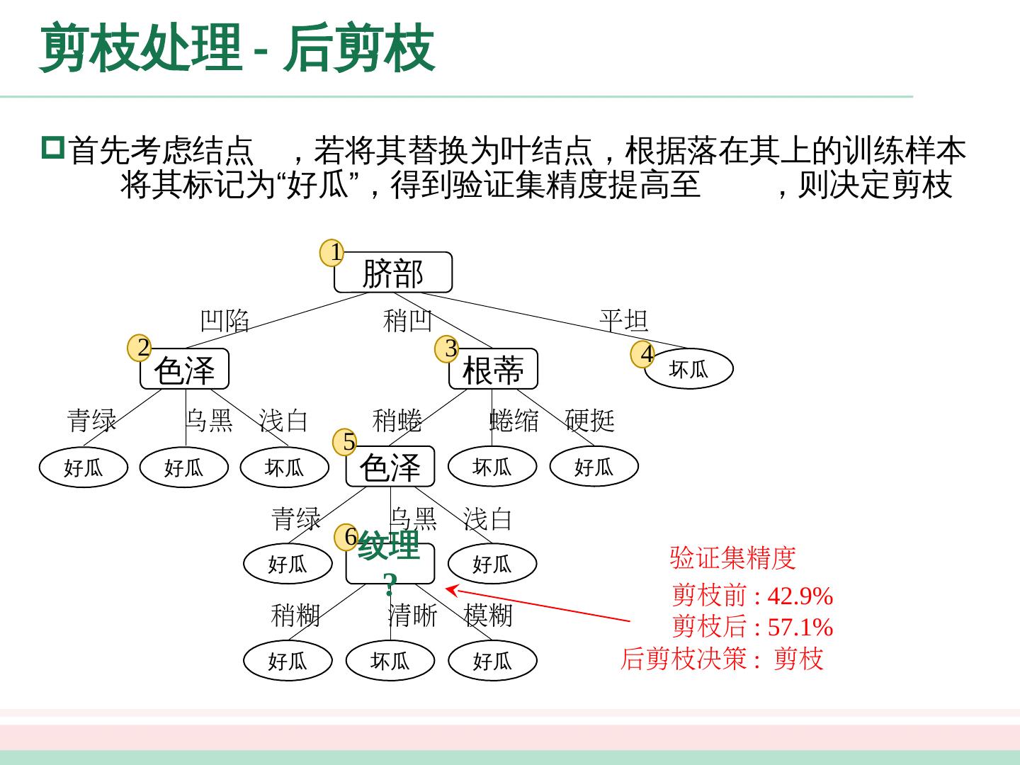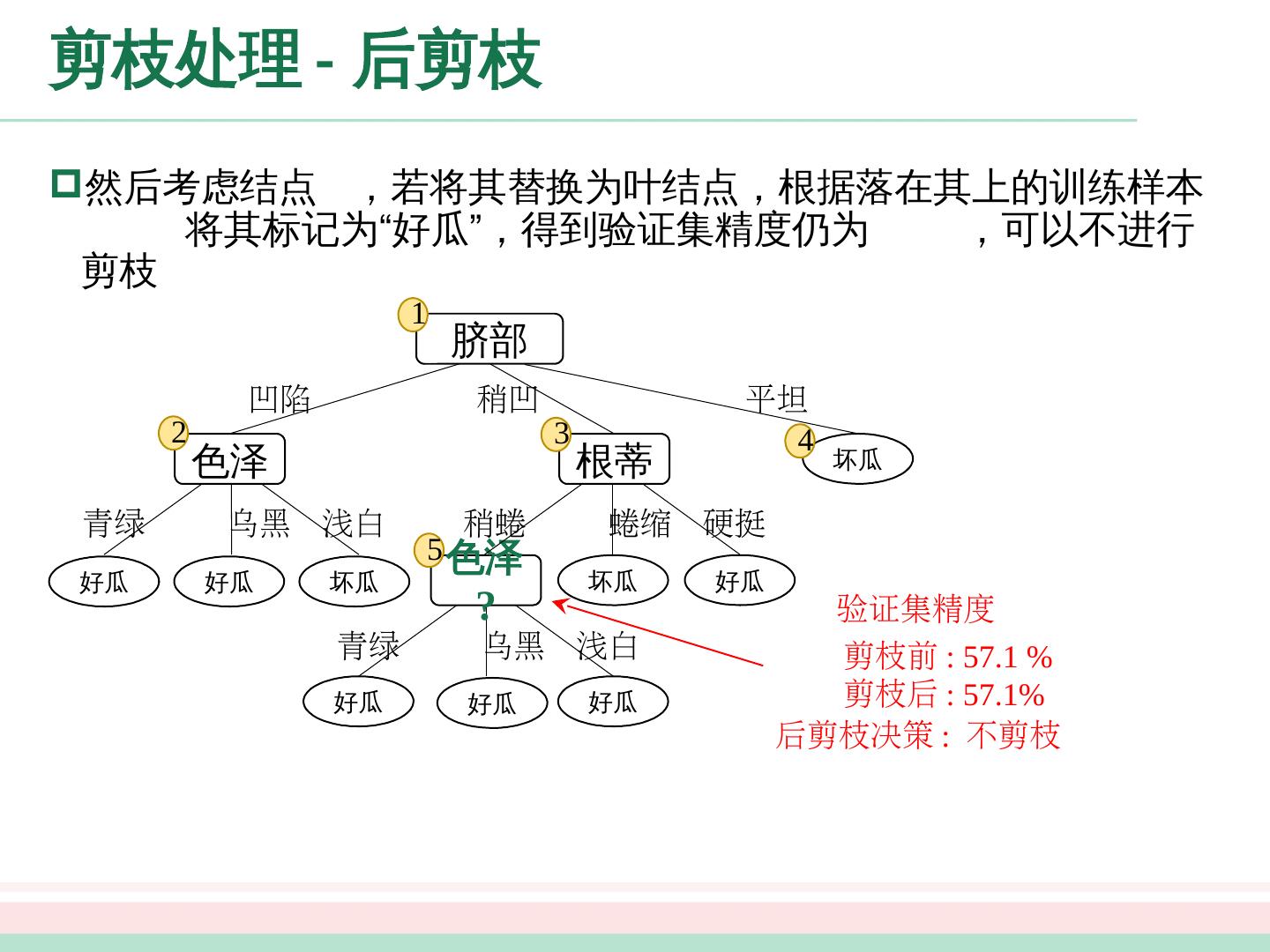 23 .剪枝处理 - 预剪枝 脐部 =? 1 “脐部 =? ” 验证集精度 划分前 : 42.9% 结点 1 :若不划分,则将其标记为叶结点,类别标记为训练样例中最多的类别,即好瓜。验证集中, 被分类正确,得到验证集精度为 验证集