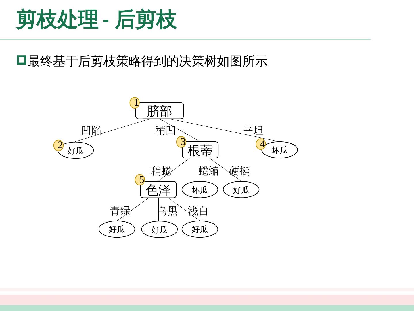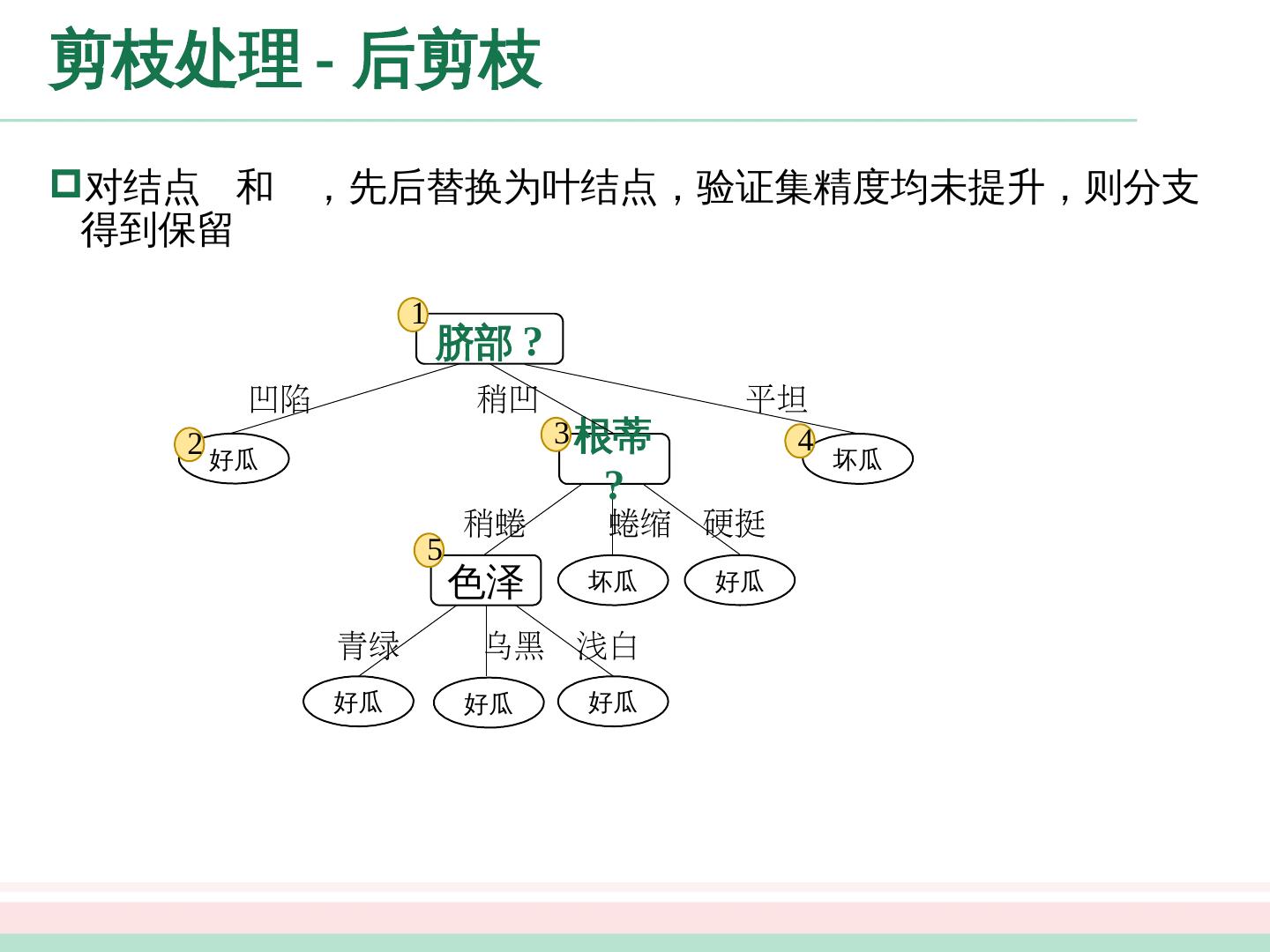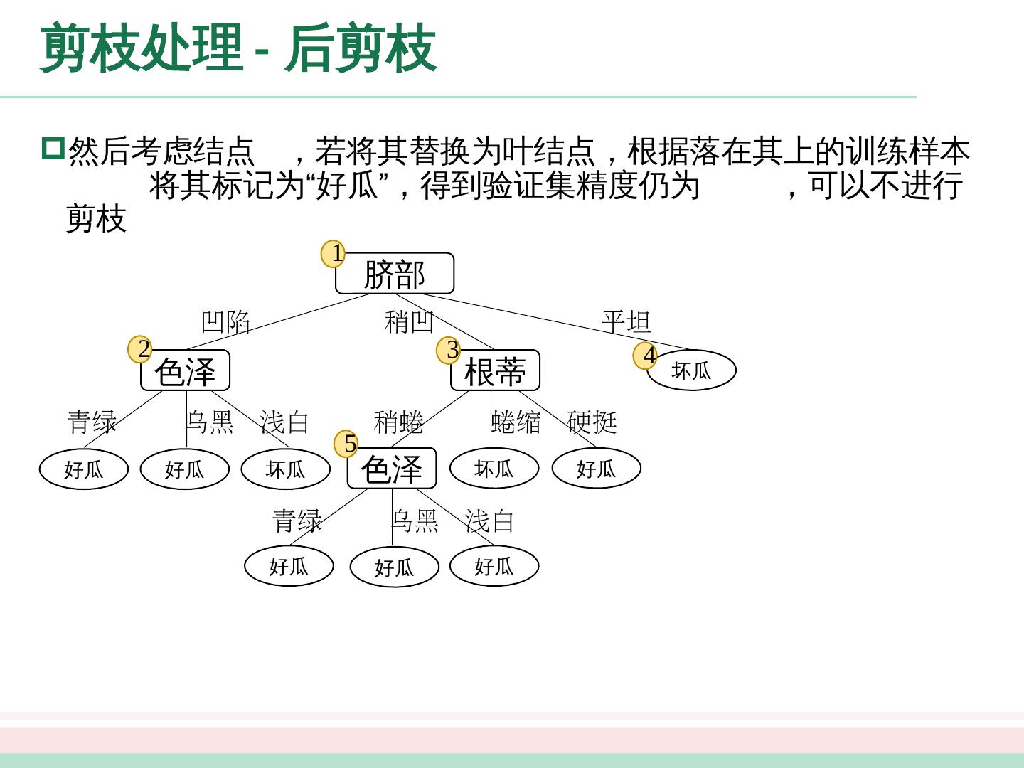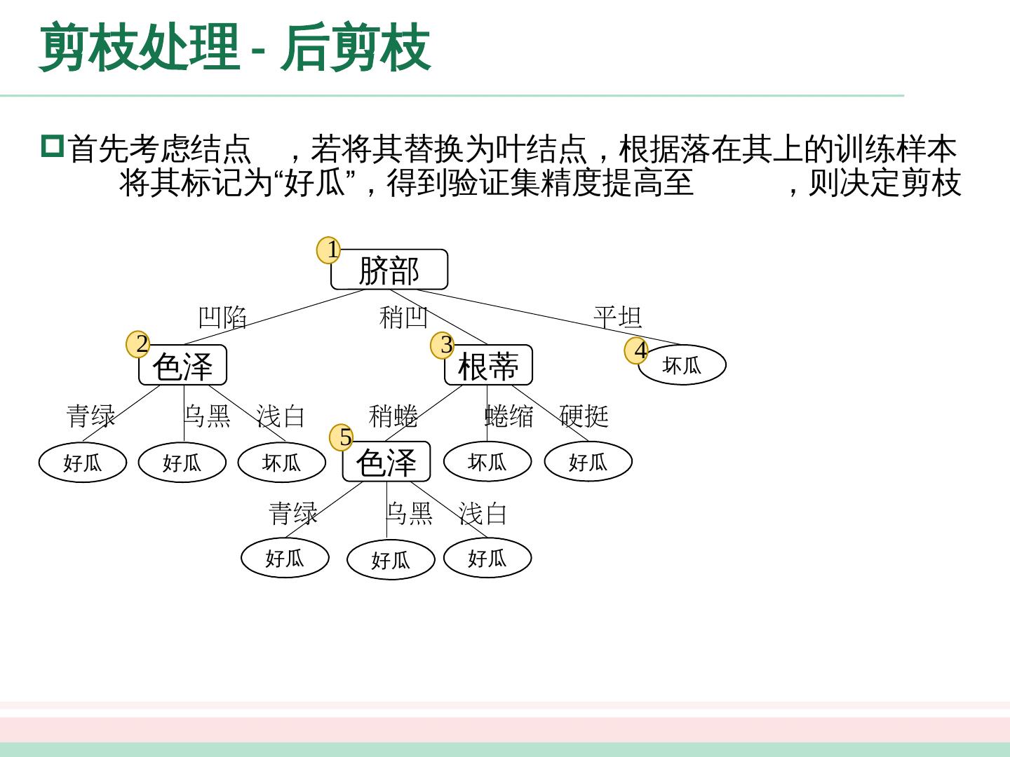 24 .剪枝处理 - 预剪枝 好瓜 坏瓜 好瓜 稍凹 平坦 凹陷 脐部 =? 1 2 3 4 “脐部 =? ” 验证集精度 划分前 : 42.9% 划分后 : 71.4% 预剪枝决策 : 划分 结点 1 :若划分,根据结点 , , 的训练样例,将这 个结点分别标记为“好瓜”、“好瓜”、“坏瓜”。此时,验证集中编号为 的样例被划分正确,验证集精度为 验证集