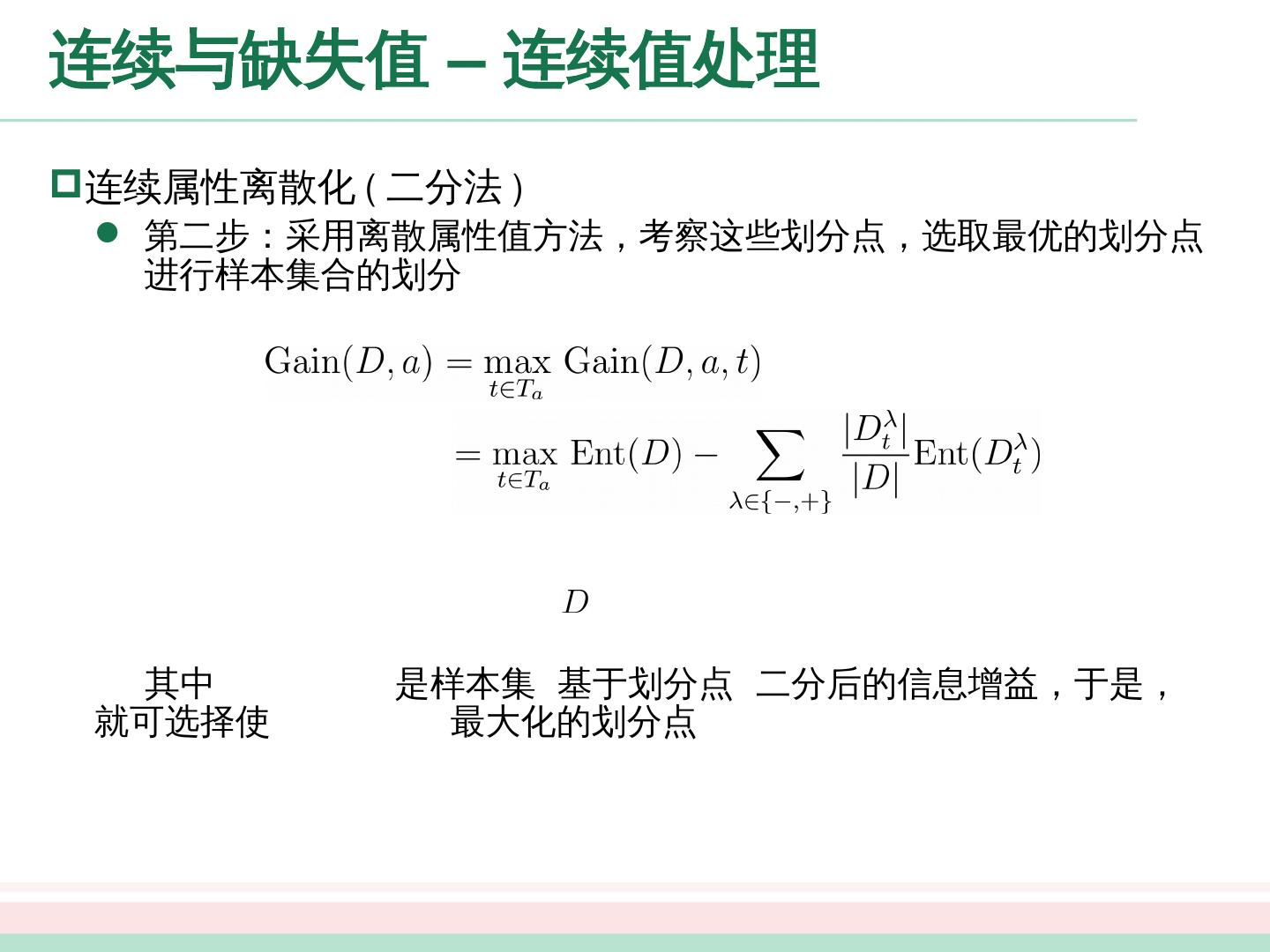 8 .划分选择 决策树学习的关键在于 如何选择最优划分属性 。一般而言,随着划分过程不断进行,我们希望决策树的分支结点所包含的样本 尽可能属于同一类别,即结点的“纯度” (purity) 越来越高 经典的属性划分方法: 信息增益 增益率 基 尼指数