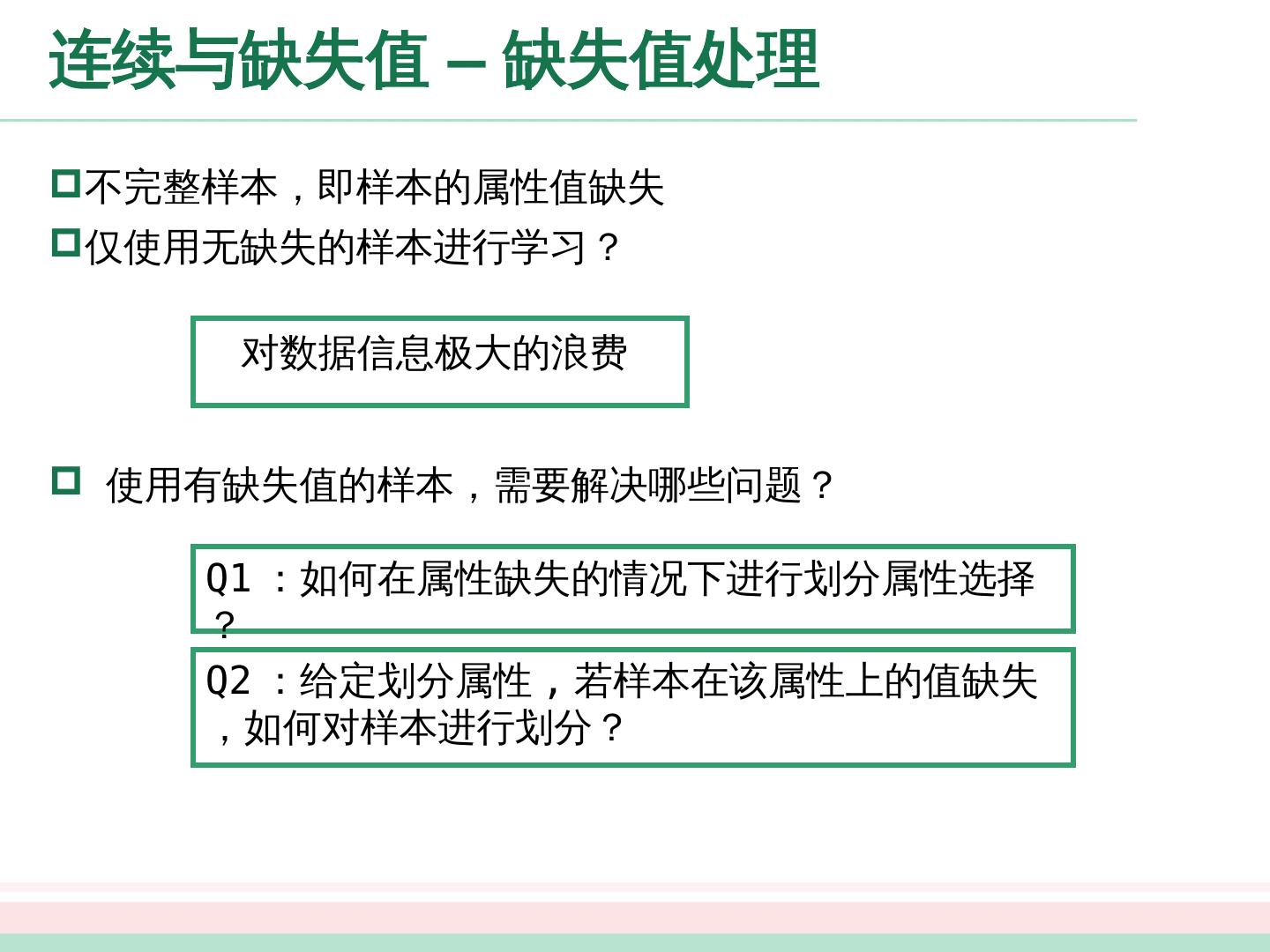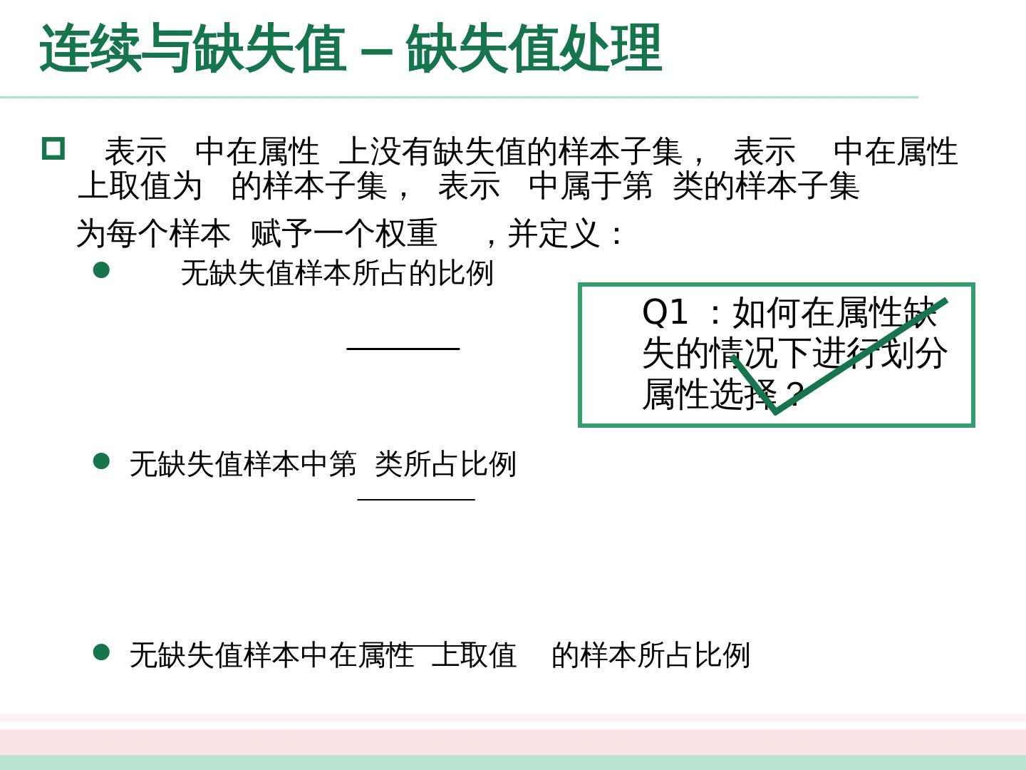 27 .剪枝处理 - 后剪枝 先从训练集生成一棵完整的决策树,然后自底向上地对非叶结点进行考察,若将该结点对应的子树替换为叶 结点 能带来决策树泛化性能提升,则将该子树替换为叶结点 好瓜 坏瓜 好瓜 清晰 纹理 模糊 稍糊 好瓜 好瓜 乌黑 浅白 青绿 色泽 坏 瓜 好瓜 蜷缩 硬挺 稍蜷 根蒂 好瓜 坏瓜 好瓜 乌黑 浅白 青绿 色泽 坏 瓜 脐部 平坦 稍凹 凹陷 1 2 3 4 5 6 首先生成一棵完整的决策树,该决策树的验证集精度为
