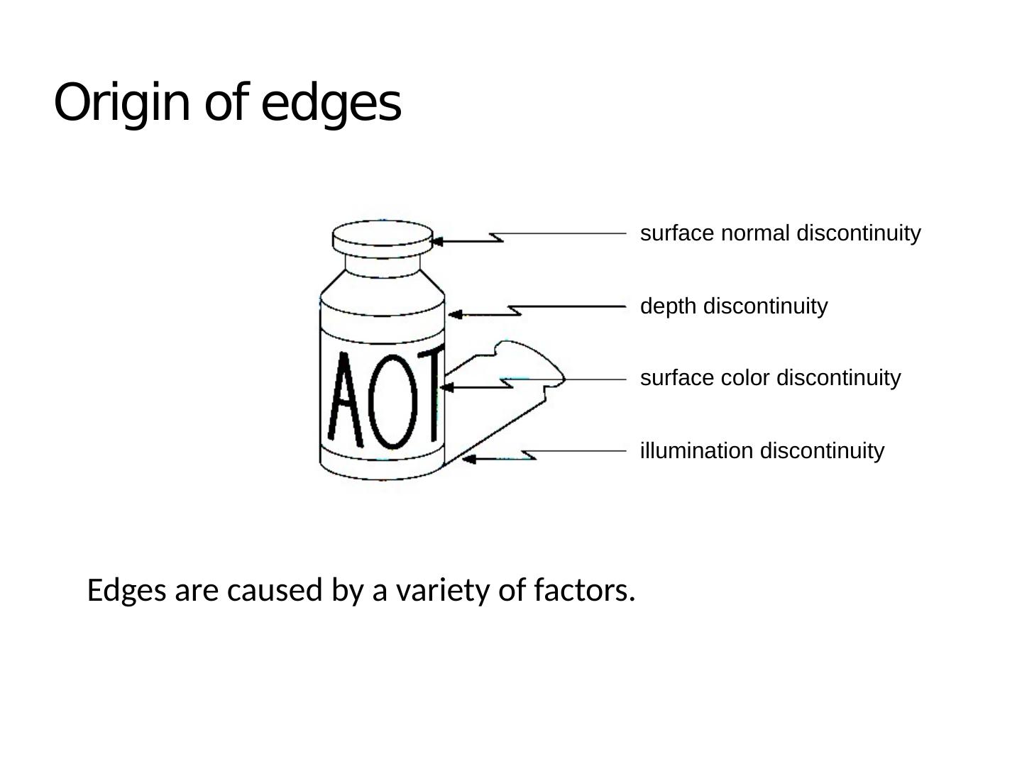 3 .Edges are caused by a variety of factors. depth discontinuity surface color discontinuity illumination discontinuity surface normal discontinuity Origin of edges