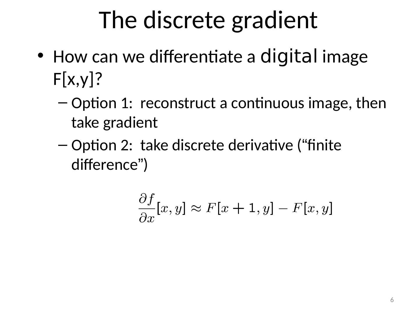 6 .The discrete gradient How can we differentiate a digital image F[ x,y ]? Option 1: reconstruct a continuous image, then take gradient Option 2: take discrete derivative ( “ finite difference ” ) 6