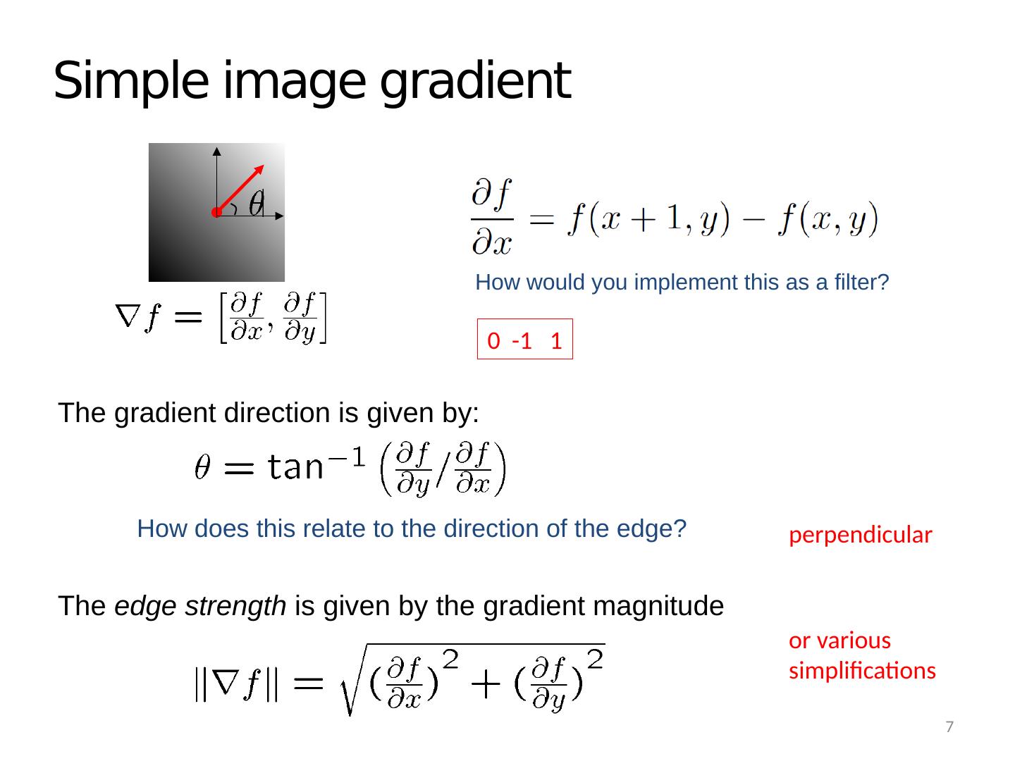 7 .The gradient direction is given by: H ow does this relate to the direction of the edge? The edge strength is given by the gradient magnitude Simple image gradient How would you implement this as a filter? 7 perpendicular or various simplifications 0 -1 1