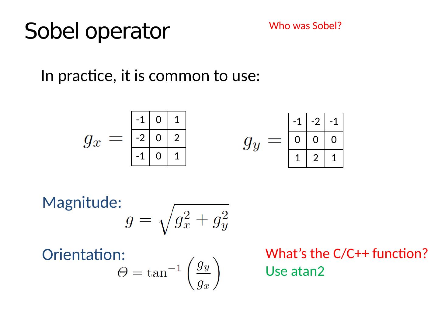 8 .Sobel operator -1 0 1 -2 0 2 -1 0 1 -1 -2 -1 0 0 0 1 2 1 Magnitude: Orientation: In practice, it is common to use: What’s the C/C++ function? Use atan2 Who was Sobel?