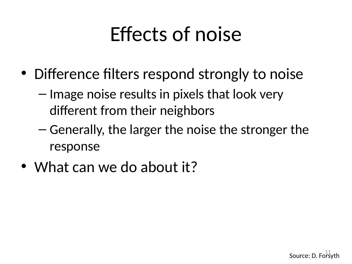 11 .Effects of noise Difference filters respond strongly to noise Image noise results in pixels that look very different from their neighbors Generally, the larger the noise the stronger the response What can we do about it? Source: D. Forsyth 11
