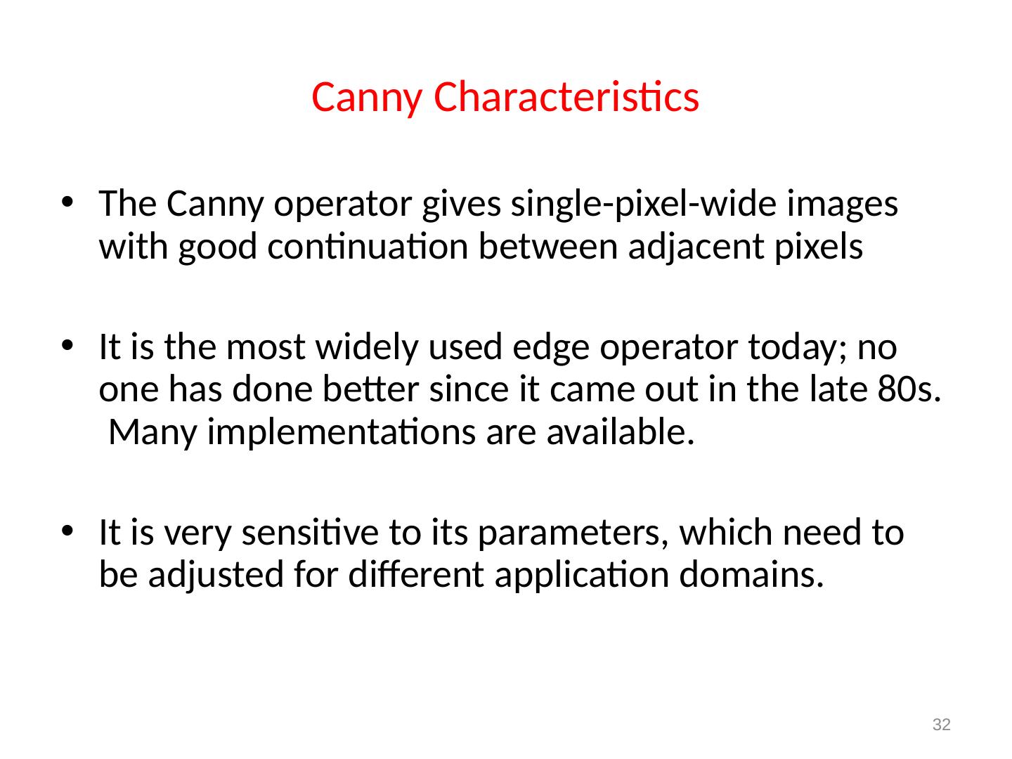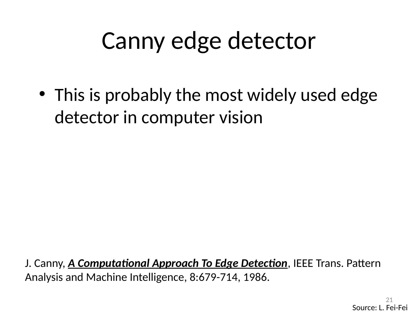 21 .Canny edge detector This is probably the most widely used edge detector in computer vision J. Canny, A Computational Approach To Edge Detection , IEEE Trans. Pattern Analysis and Machine Intelligence, 8:679-714, 1986. Source: L. Fei-Fei 21