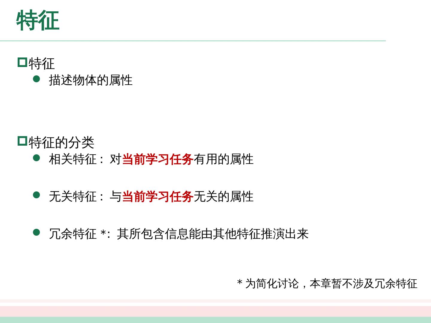 3 .特征 特征 描述物体的 属性 特征的 分类 相关特征 : 对 当前学习任务 有用的 属性 无关特征 : 与 当前学习任务 无关的 属性 冗余 特征* : 其所包含信息能由其他特征 推演出来 * 为简化讨论,本章 暂不 涉及冗余 特征