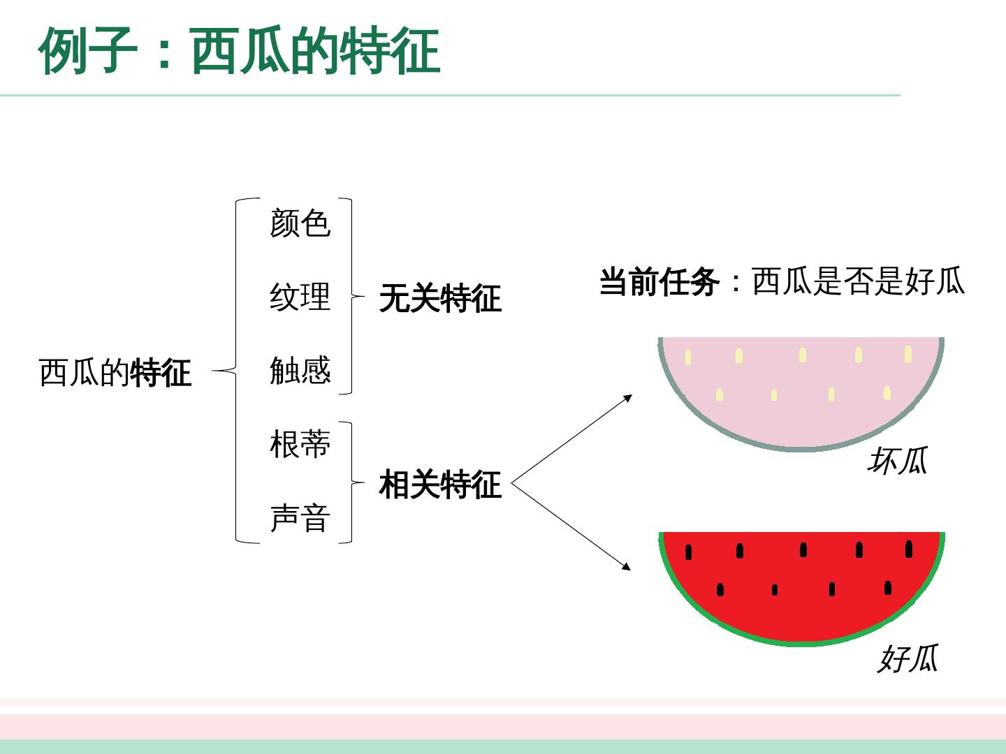 4 .例子:西瓜的特征 西瓜的 特征 颜色 纹理 触感 根 蒂 声音 相关 特征 无关特征 好 瓜 坏 瓜 当前任务 :西瓜是否是好瓜