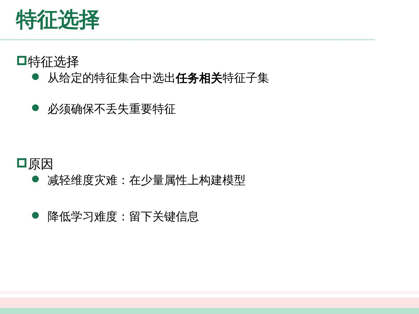 5 .特征选择 特征选择 从给定的特征集合中选出 任务相关 特征 子集 必须确保不丢失重要特征 原因 减轻维度灾难:在少量属性上构建 模型 降低学习难度:留下关键信息