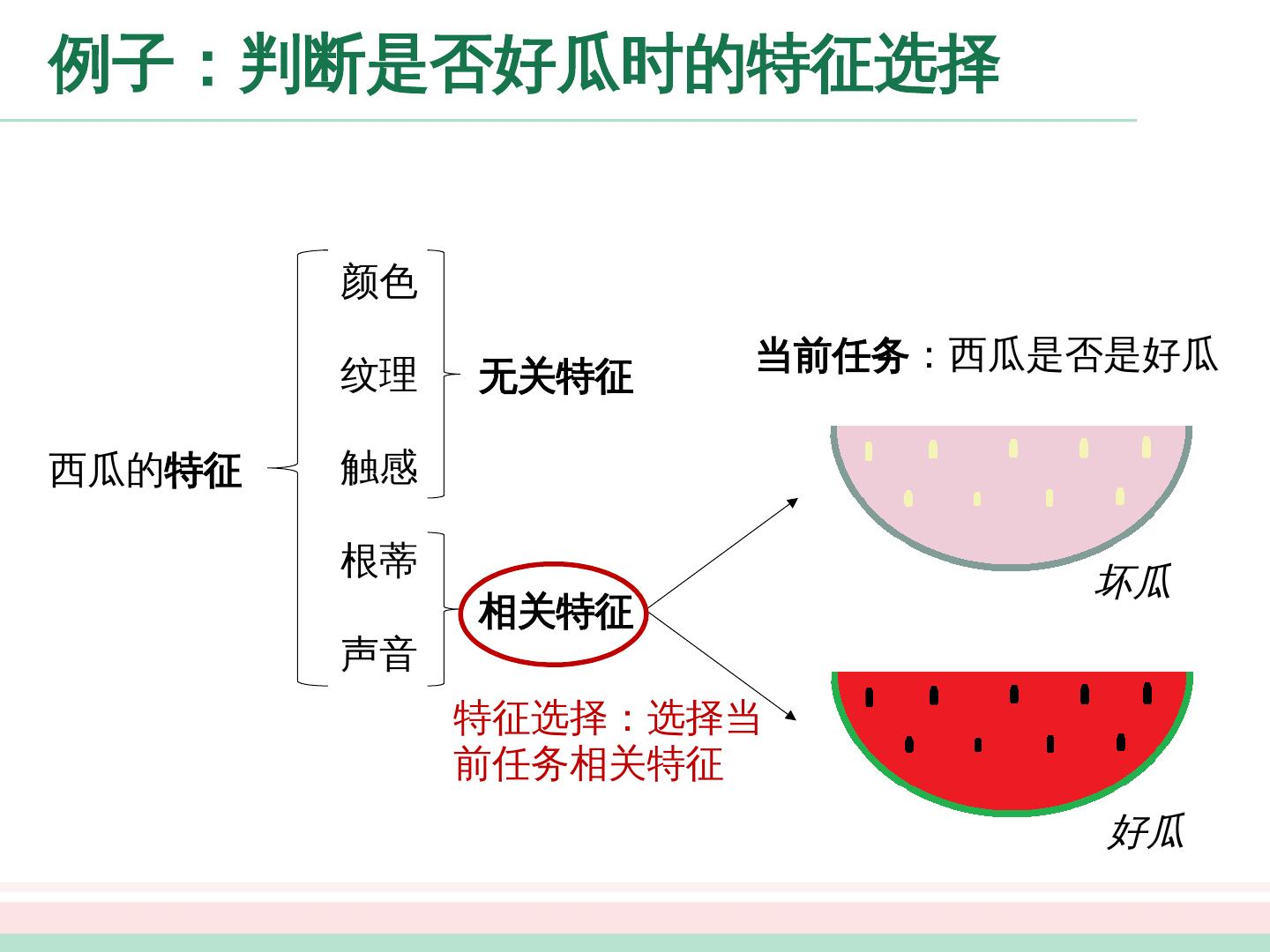 6 .例子 :判断是否好瓜时的特征选择 西瓜的 特征 颜色 纹理 触感 根 蒂 声音 相关 特征 无关特征 好 瓜 坏 瓜 当前任务 :西瓜是否是好瓜 特征选择:选择当前任务相关特征