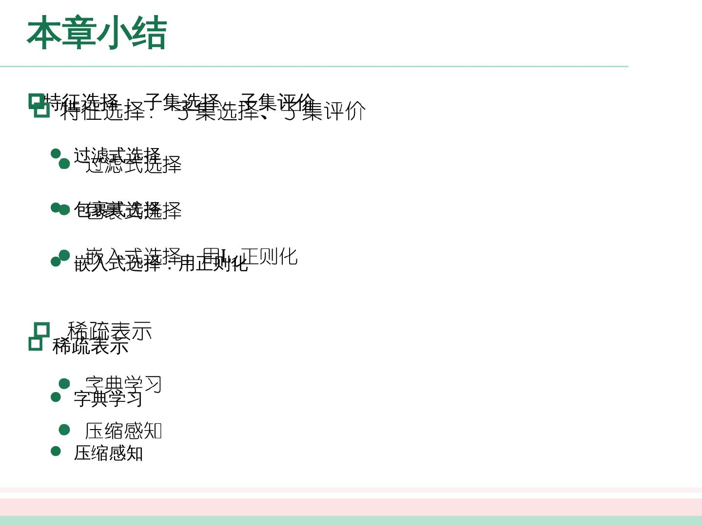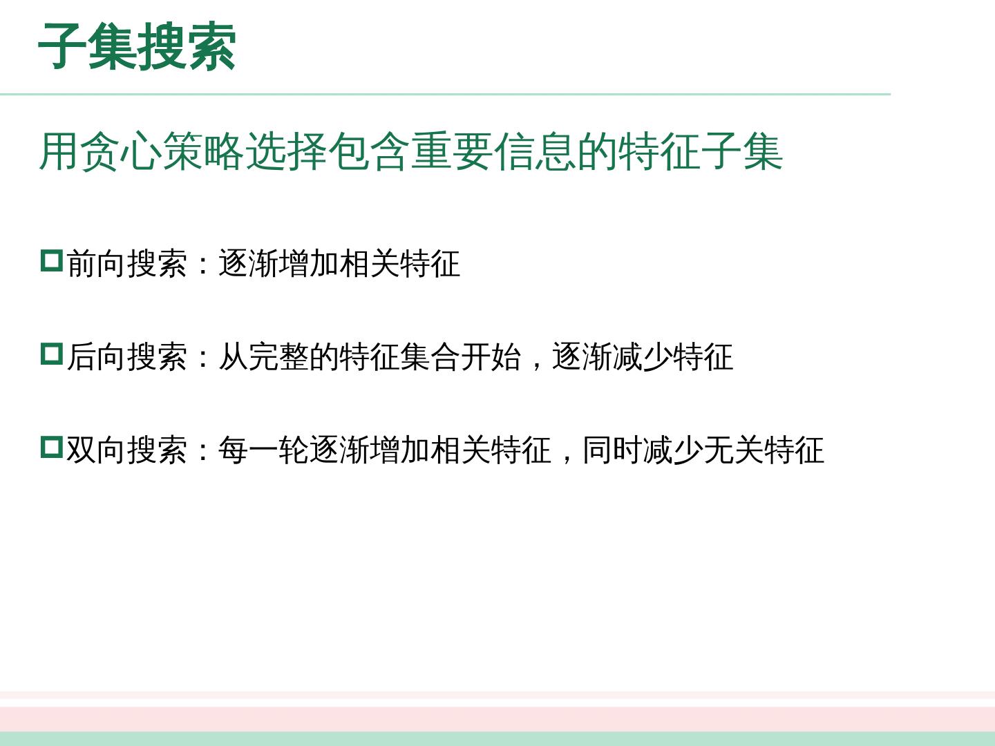 8 .子集 搜索 前向搜索:逐渐增加相关特征 后向搜索:从完整的特征集合开始,逐渐减少特征 双向搜索:每一轮逐渐增加相关特征,同时减少无关特征 用贪心策略选择包含重要信息的特征子集