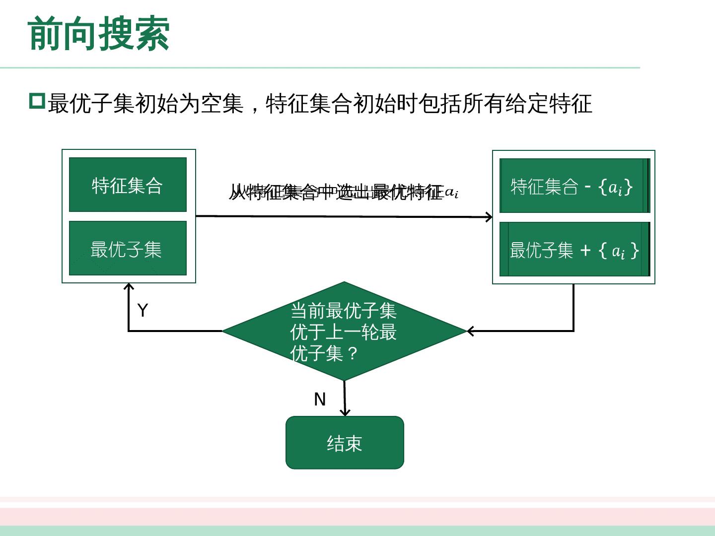 9 .特征集合 最优子 集 特征集合 - { } 最优子集 + { } 从特征集合中选出最优特征 当前 最优 子集优于 上一轮最优 子集? Y N 前向搜索 最优子集初始为空集,特征集合初始时包括所有给定特征 结束
