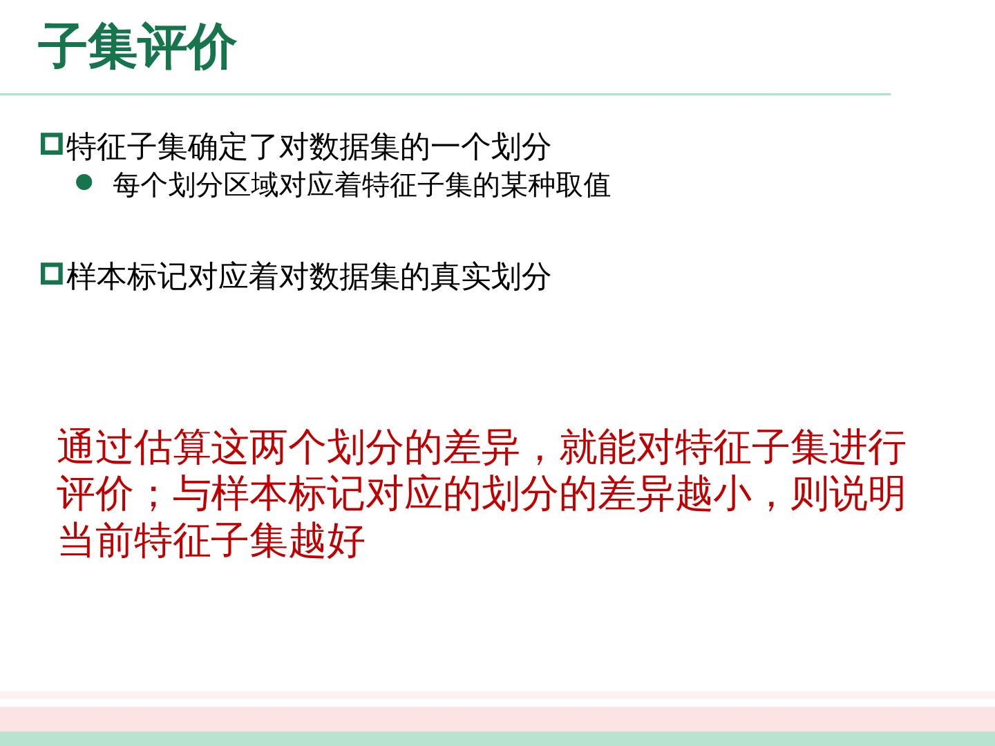 10 .子集 评价 特征子集确定了对数据集的一个划分 每个划分区域对应着特征 子集 的某种取值 样本标记对应着对 数据 集的真实划分 通过估算这两个划分的差异,就能对 特征 子集进行评价;与样本标记对应的划分的差异越小,则说明当前特征子集越好
