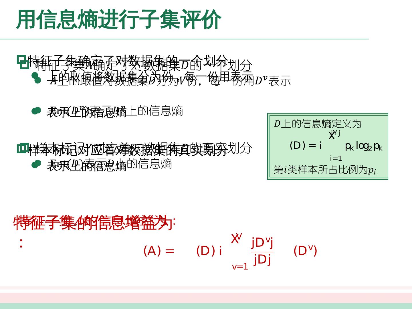 11 .用信息熵进行子集 评价 特征子集 确定了对数据集 的一个划分 上的取值将 数据 集 分为 份 ,每一份用 表示 表示 上的信息熵 样本标记 对应着对 数据 集 的真实划分 表示 上的 信息熵 特征子集 的信息增益为: 上的信息熵定义为 第 类样本所占比例为