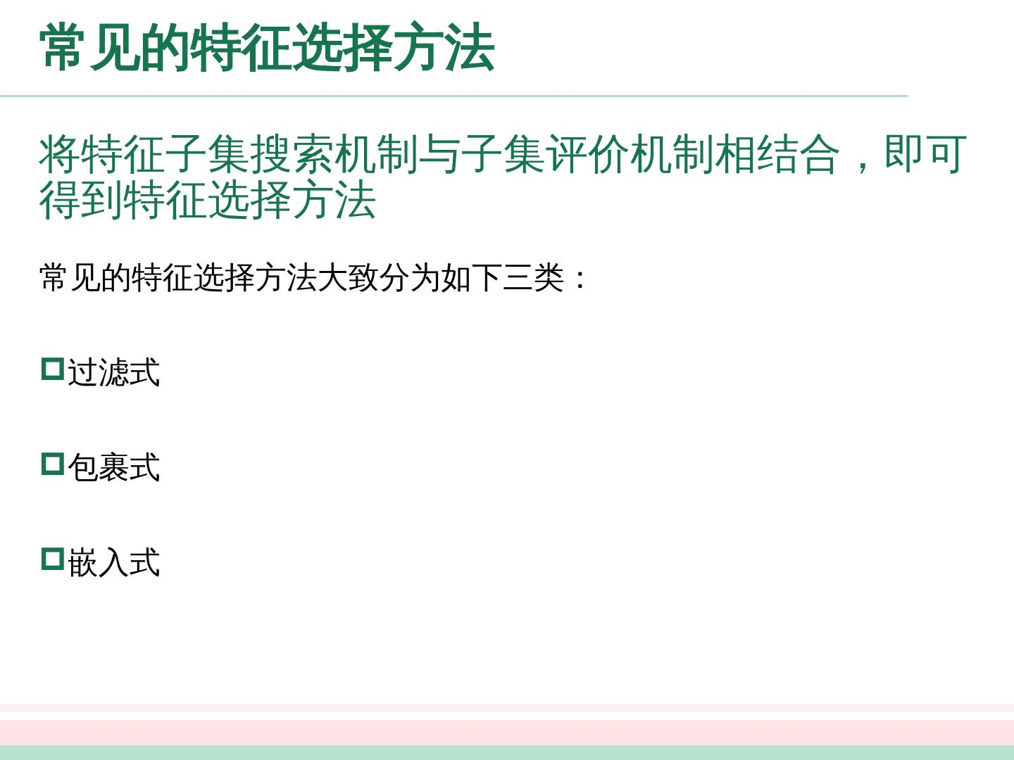 12 .常见的特征选择方法 常见的特征选择方法大致分为如下三类: 过滤式 包裹式 嵌入式 将特征子集搜索机制与子集评价机制相结合,即可得到特征选择方法