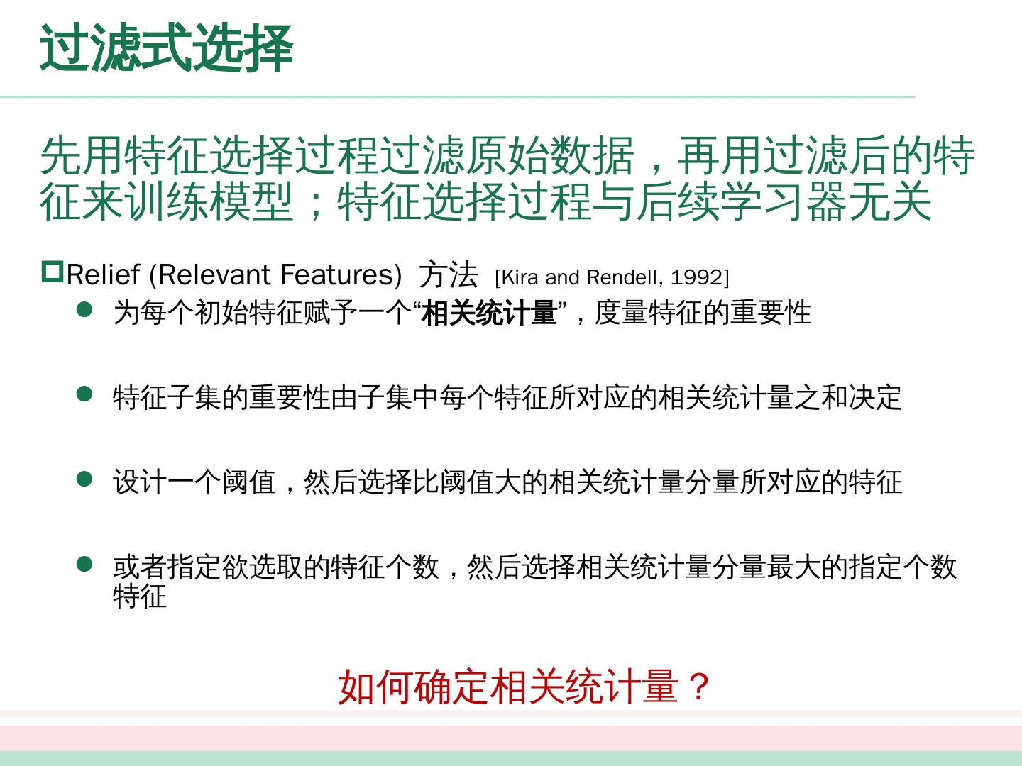 13 .过滤式选择 Relief (Relevant Features) 方法 [Kira and Rendell, 1992 ] 为 每个初始特征 赋予一个 “ 相关统计量 ”,度量特征的重要性 特征子集的重要性由子集中每个特征所对应的相关统计量之和决定 设计一个阈值,然后选择比阈值大的相关统计量分量所对应的特征 或者指定欲选取的特征个数,然后选择相关统计量分量最大的指定个数特征 如何确定相关统计量? 先用特征选择 过程过滤原始数据, 再用过滤后的特征来训练模型 ;特征选择 过程与后续学习器 无关
