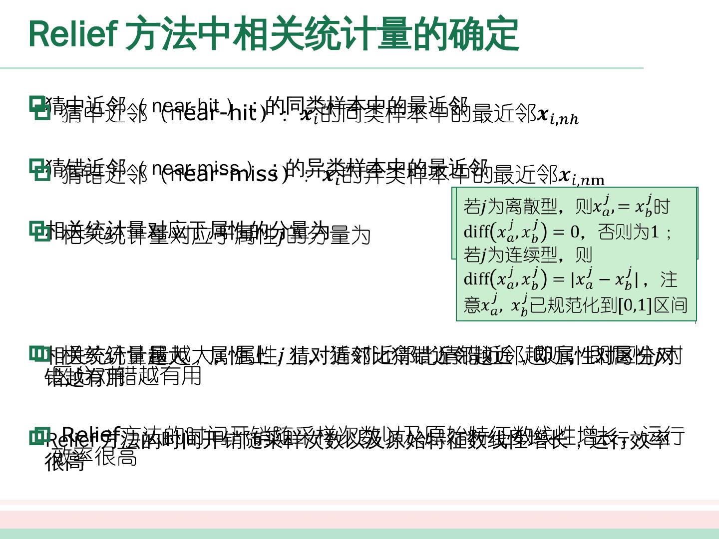 14 .Relief 方法中相关统计量的确定 猜中近邻( near-hit ): 的同类样本中的最近邻 猜错近邻( near-miss ) : 的 异 类 样本中的最近邻 相关统计量对应于属性 的分量为 相关统计量越大, 属性 上 ,猜对近邻比猜错近邻越近,即 属性 对 区分对错越 有用 Relief 方法的时间开销随采样次数以及原始特征数线性增长,运行效率很高 若 为离散型,则 时 ,否则为 ;若 为连续型, 则 ,注意 已规范化到 区间