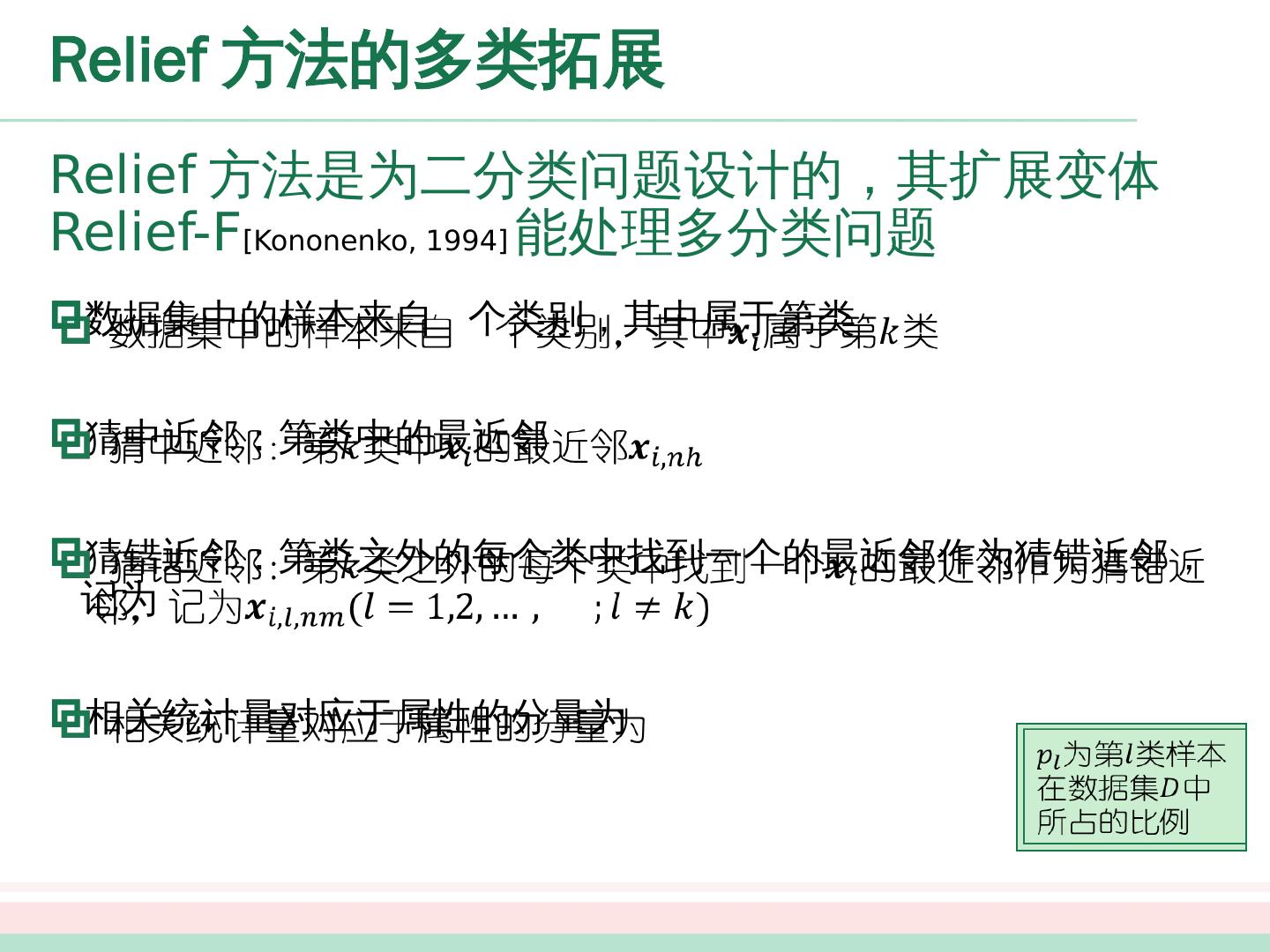 15 .Relief 方法的多类拓展 数据集中的样本来自 个类别,其中 属于第 类 猜中近邻:第 类中 的最近邻 猜错近邻:第 类之外的每个类中找到一个 的最近邻作为猜错近邻,记为 相关统计量对应于属性的分量为 Relief 方法是为二分类问题设计的,其扩展变体 Relief-F [ Kononenko , 1994] 能处理多分类问题 为第 类样本在数据集 中所占的比例