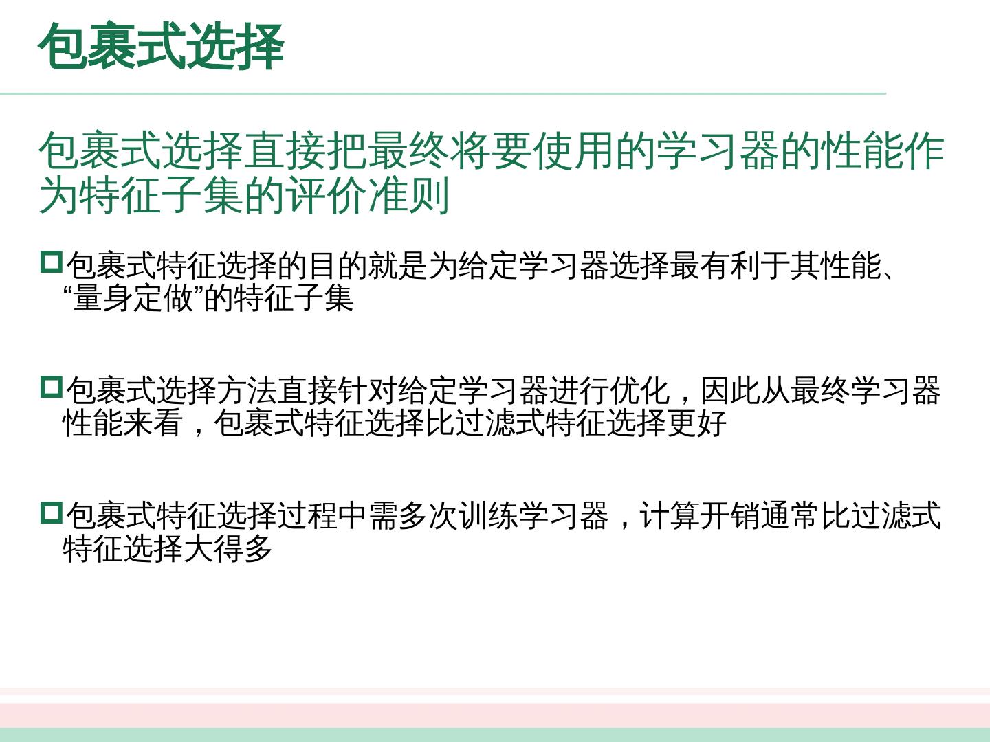 16 .包裹式选择 包裹式特征选择的目的就是为给定学习器选择最有利于其性能、“量身定做”的特征 子集 包裹式选择方法直接针对给定学习器进行优化,因此从最终学习器性能来看,包裹式特征选择比过滤式特征选择更好 包裹式特征选择过程中需多次训练学习器,计算开销通常比过滤式特征选择大得多 包裹式选择直接把最终将要使用的学习器的性能作为特征子集的评价准则