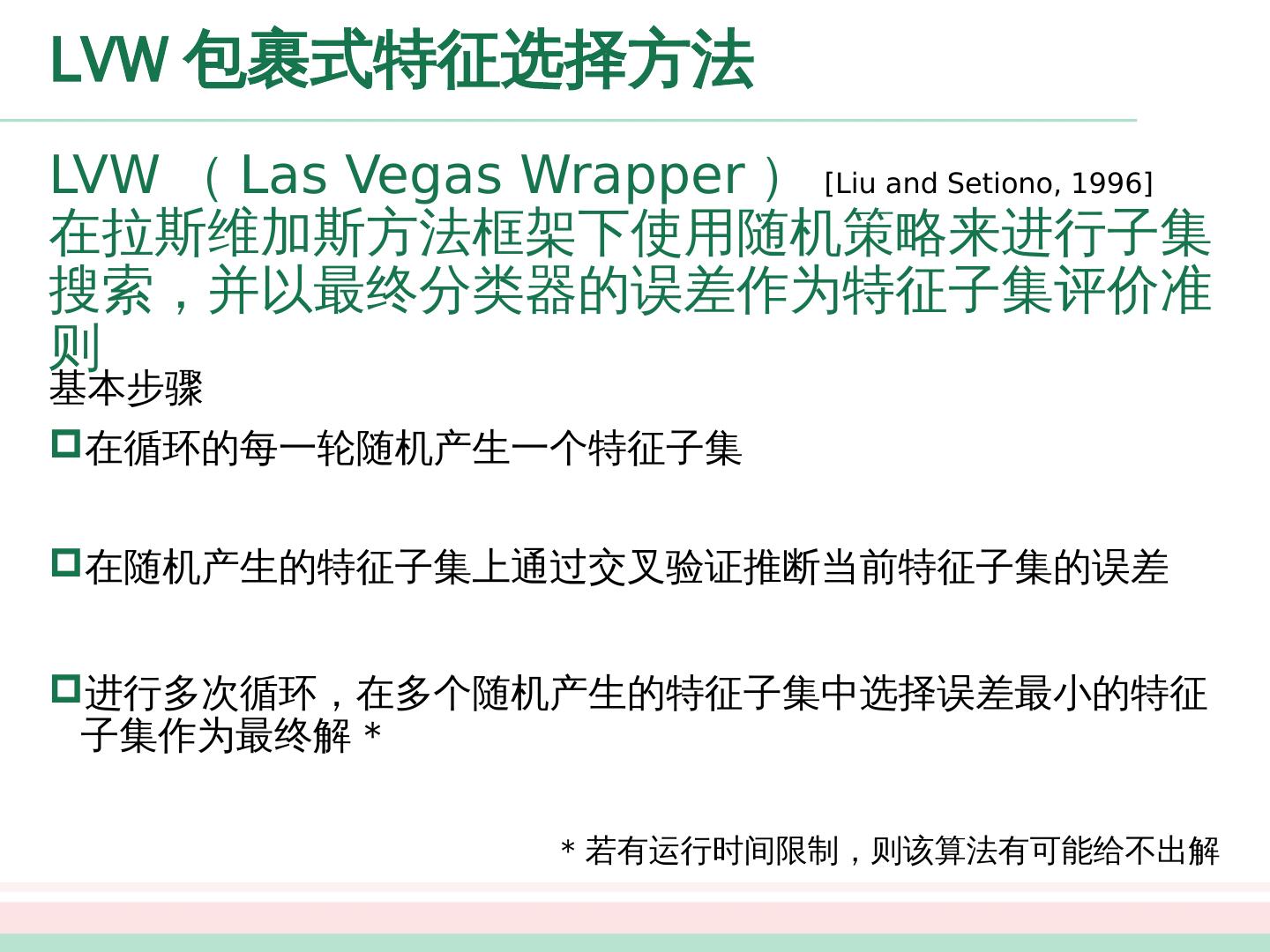 17 .LVW 包裹式特征选择方法 基本步骤 在循环的每一轮随机产生一个特征子集 在随机产生 的特征子集上通过交叉验证推断当前特征子集的 误差 进行多次循环,在多个随机产生的特征子集中选择误差最小的特征子集作为最终解 * * 若有运行时间限制,则该算法有可能给不出解 LVW ( Las Vegas Wrapper ) [Liu and Setiono , 1996] 在拉斯维加斯方法框架下使用随机策略来进行子集搜索,并以最终分类器的误差作为特征子集评价 准则