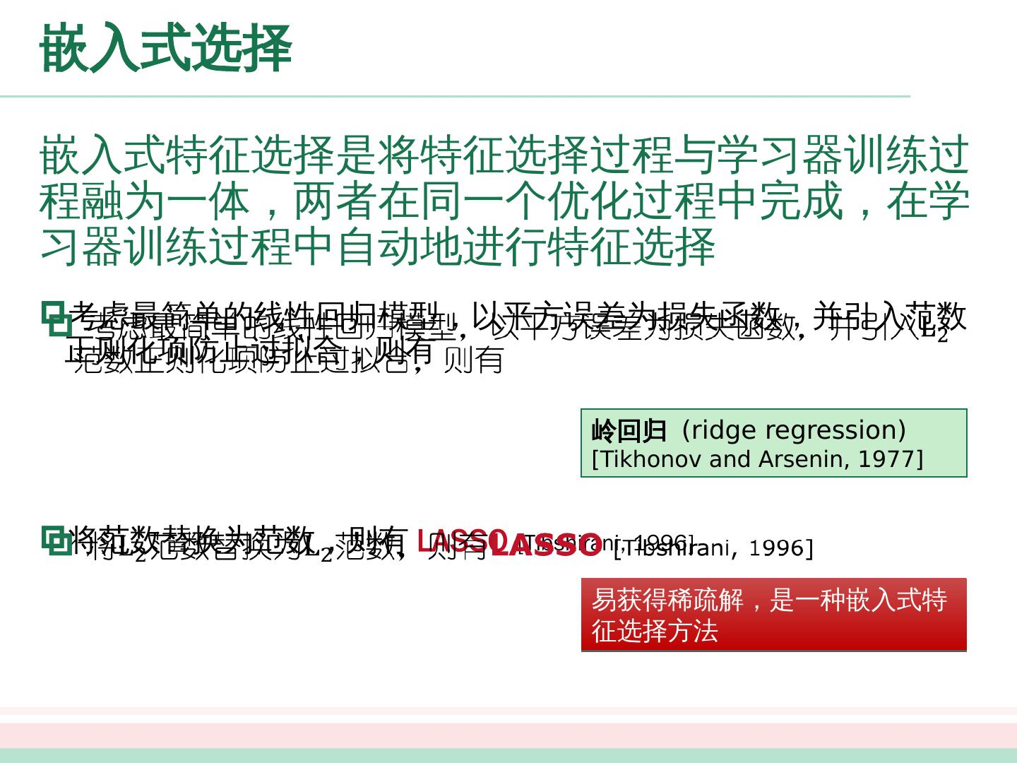 18 .嵌入式选择 考虑最简单的线性回归模型,以平方误差为损失函数,并引入 范数正则化项防止过拟合,则有 将 范数替换为 范数,则有 LASSO [Tibshirani, 1996] 嵌入式特征选择是将特征选择过程与学习器训练过程融为一体,两者在同一个优化过程中完成,在学习器训练过程中自动地进行特征选择 岭回归 (ridge regression) [Tikhonov and Arsenin , 1977] 易获得稀疏解,是一种嵌入式特征选择方法