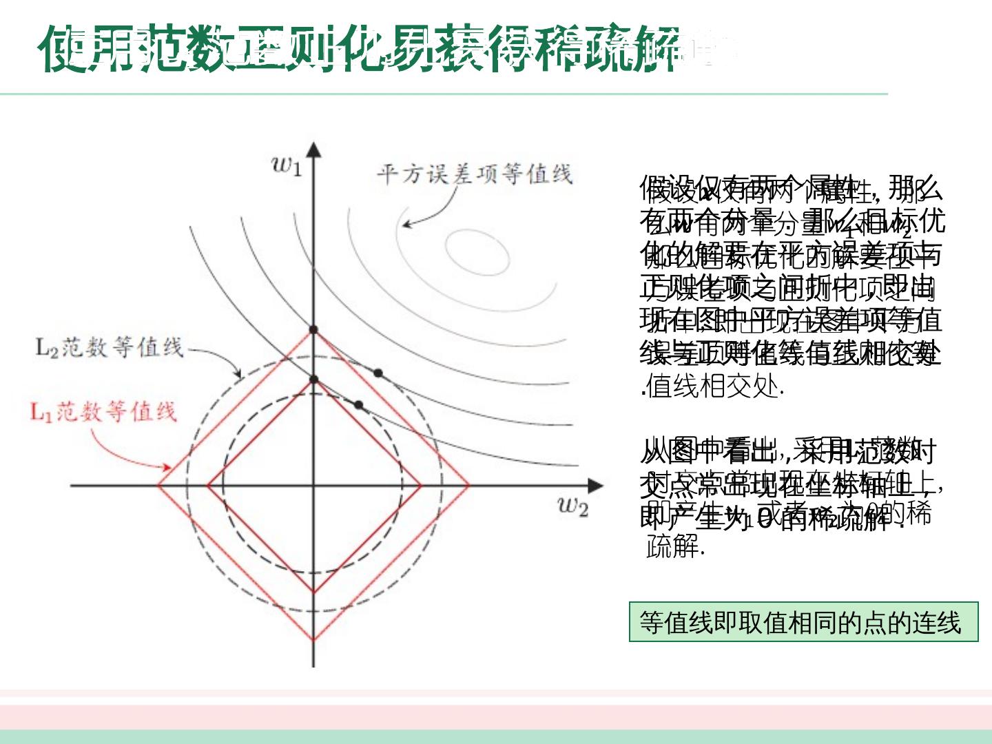 19 .使用 范数正则化易获得稀疏解 假设 仅有两个属性, 那么 有两个分量 . 那么目标优化的解要在平方误差项与正则化项之间折中 , 即出现在图中平方误差项等值线与正则化等值线相交处 . 从图中看出 , 采用 范数时交点常出现在坐标轴上 , 即产生 为 0 的稀疏解 . 等值线即取值相同的点的连线