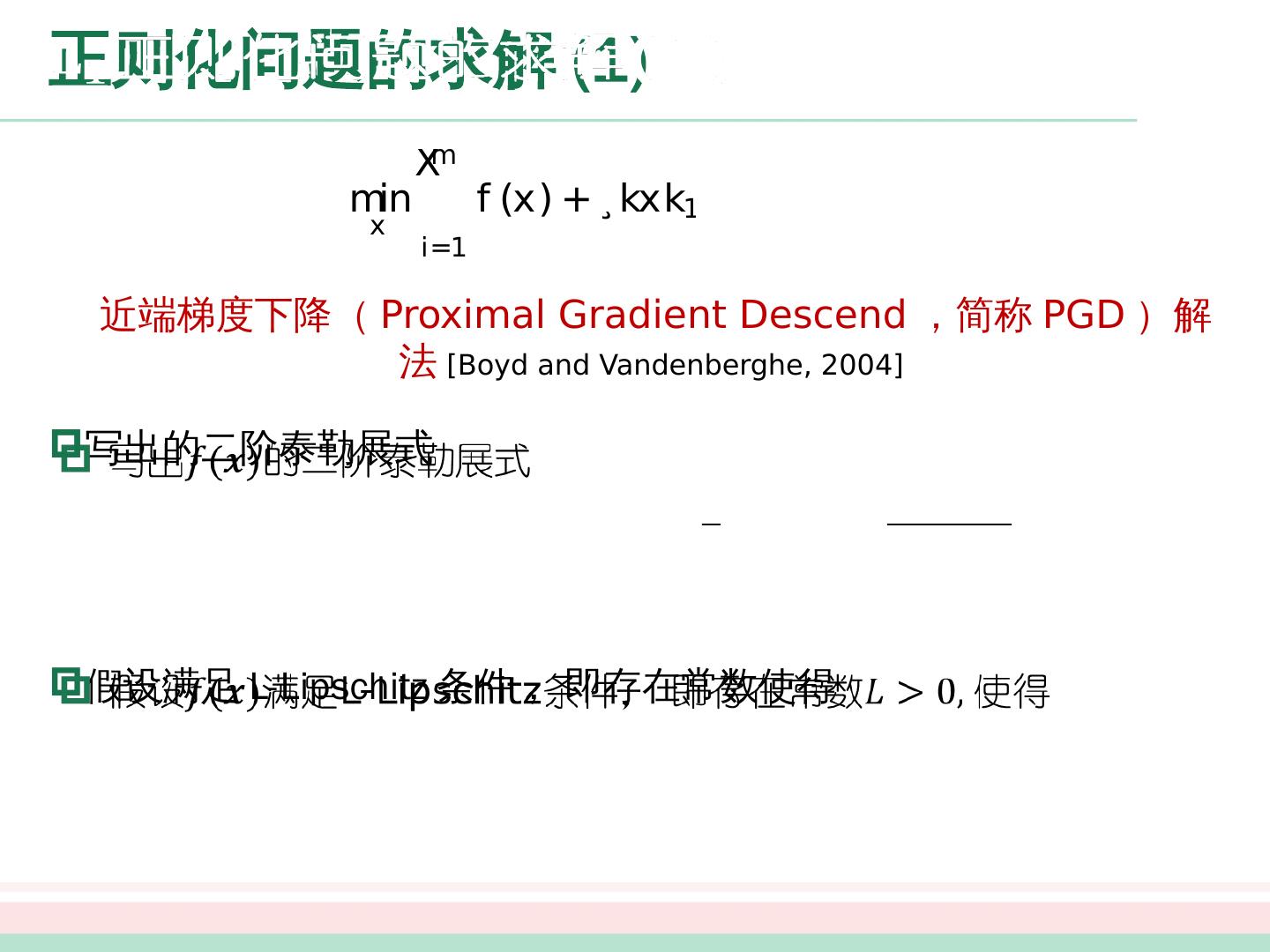 20 .正则化问题的求解 (1) 写出 的二阶泰勒展式 假设 满足 L-Lipschitz 条件, 即存在常数 使得 近端梯度下降( Proximal Gradient Descend ,简称 PGD )解法 [ Boyd and Vandenberghe , 2004]
