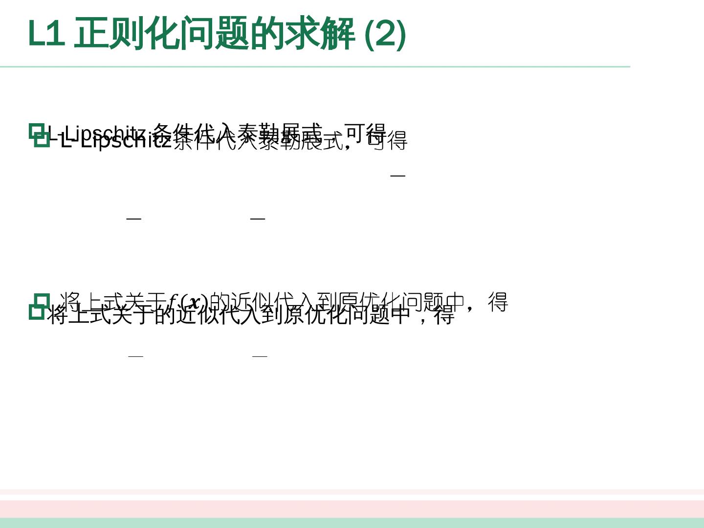 21 .L1 正则化问题的求解 (2) L-Lipschitz 条件代入泰勒展式,可 得 将上式关于 的近似代入到原优化问题中,得