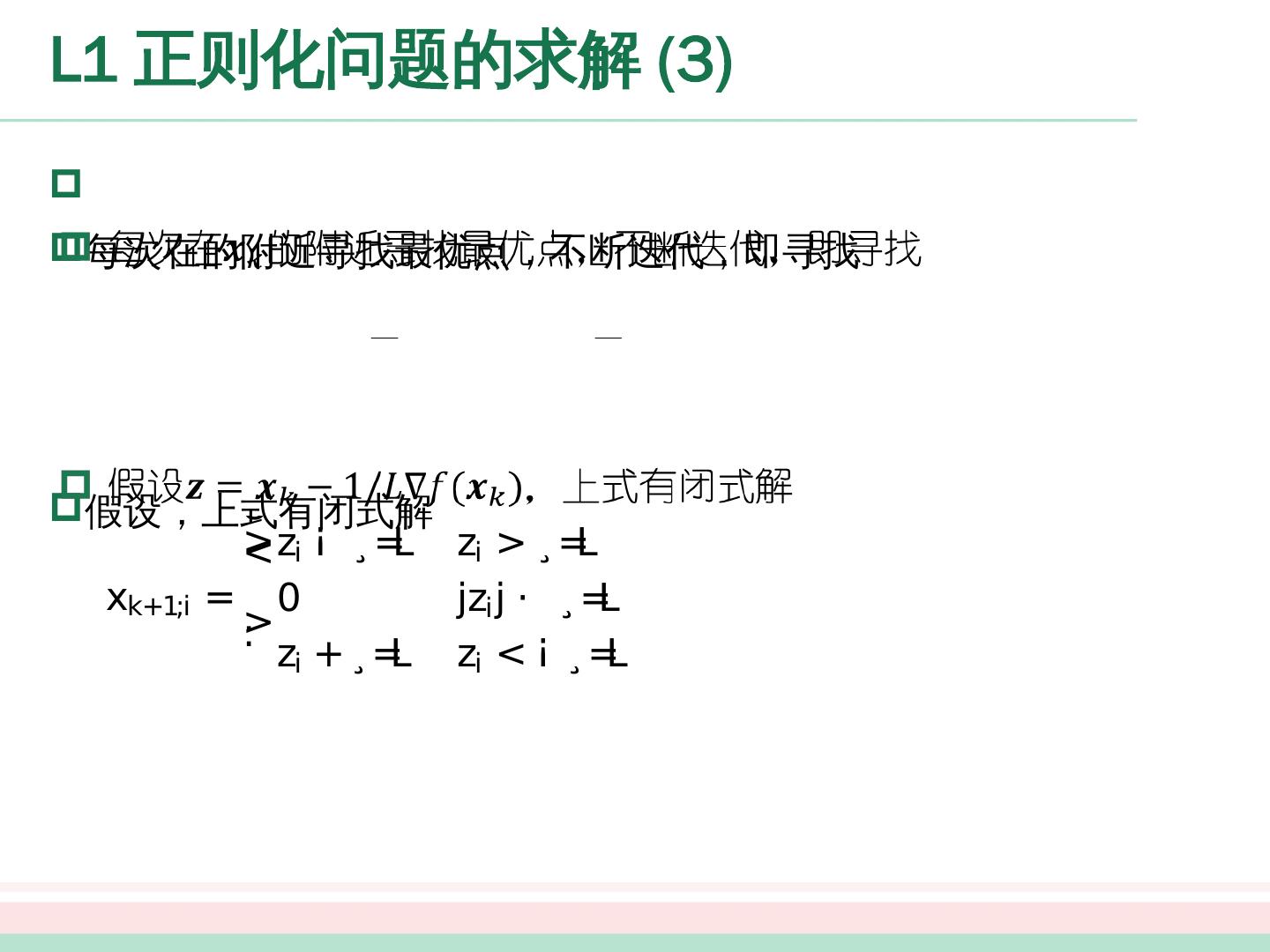 22 .L1 正则化问题的求解 (3) 每次在 的 附近寻找最优点,不断迭代, 即寻找 假设 ,上式有闭式解