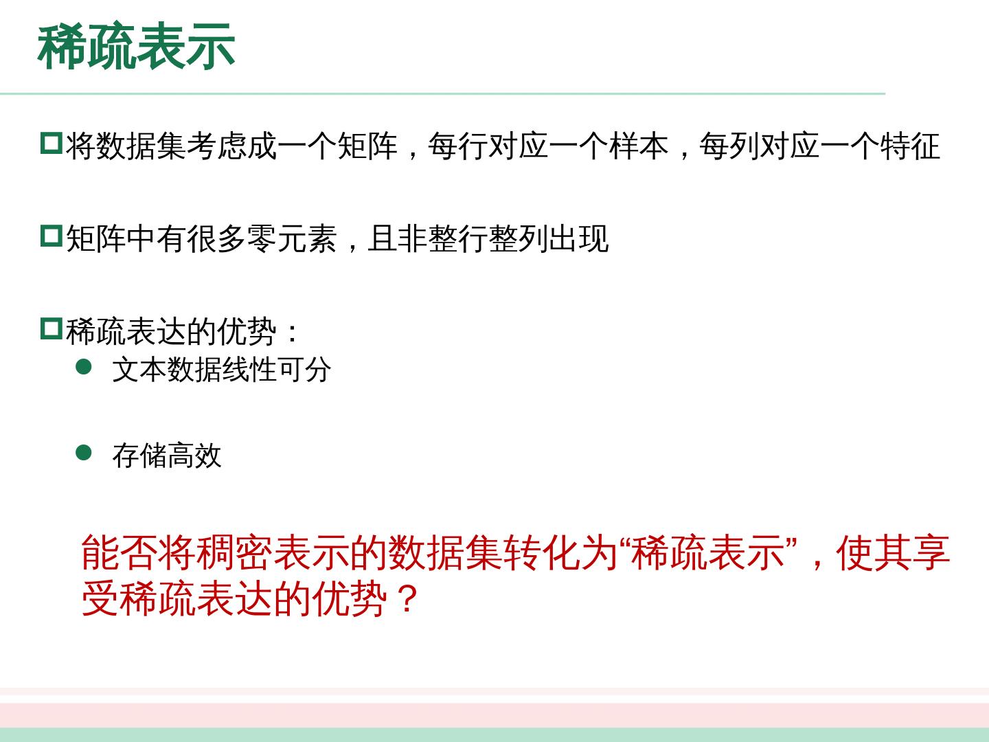 23 .稀疏表示 将数据集考虑成一个矩阵,每行对应一个样本,每列对应一个特征 矩阵中有很多零元素,且非整行整列出现 稀疏表达的 优势 : 文本数据线性可 分 存储高效 能否 将稠密表示的数据集转化为“稀疏表示”,使其享受稀疏表达的 优势 ?