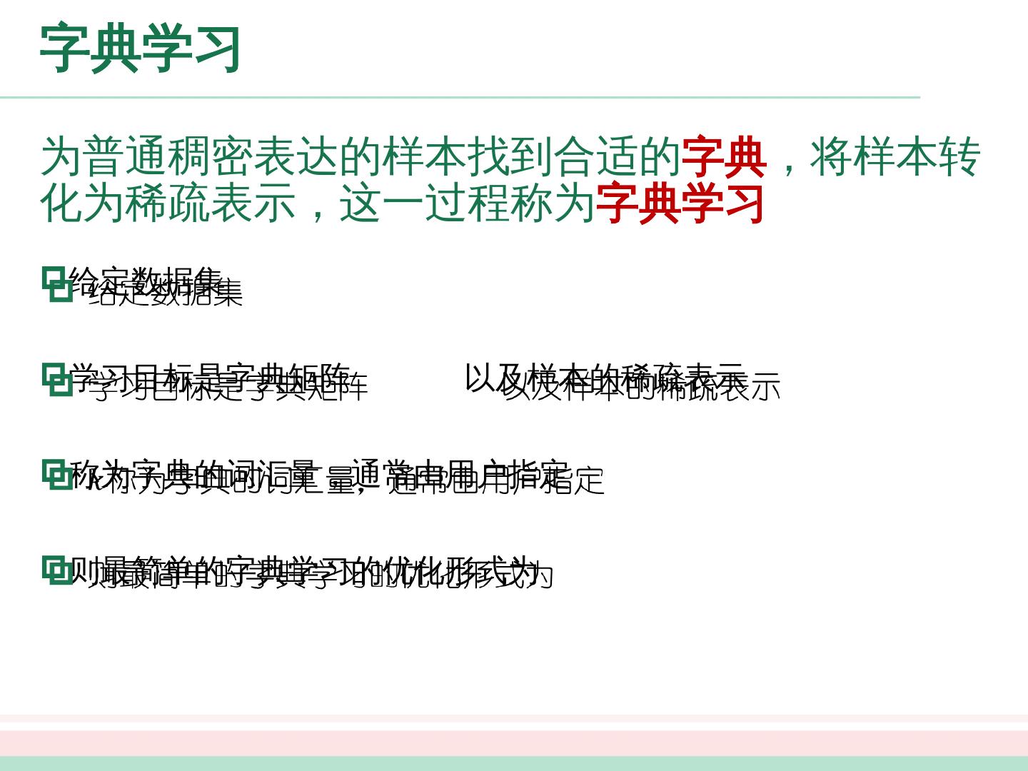 24 .字典学习 给定数据 集 学习目标是字典矩阵 以及样本的稀疏表示 称为字典的词汇量,通常由用户指定 则最简单的字典学习的优化形式为 为普通稠密表达的样本找到合适的 字典 ,将样本转化为稀疏表示,这一过程称为 字典学习