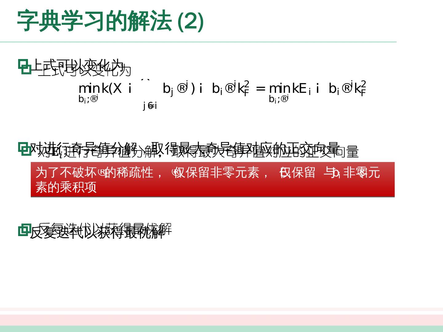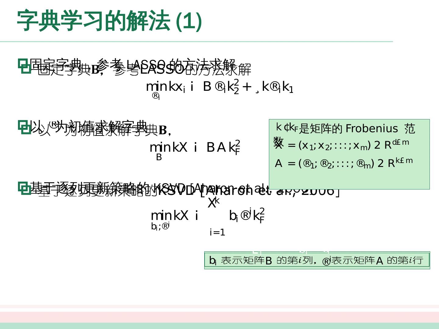 25 .字典学习的解法 (1) 固定字典 ,参考 LASSO 的方法求解 以 为初值求解字典 基于逐列更新策略的 KSVD [ Aharon et al., 2006] 是矩阵的 Frobenius 范数 表示矩阵 的第 列, 表示矩阵 的第 行