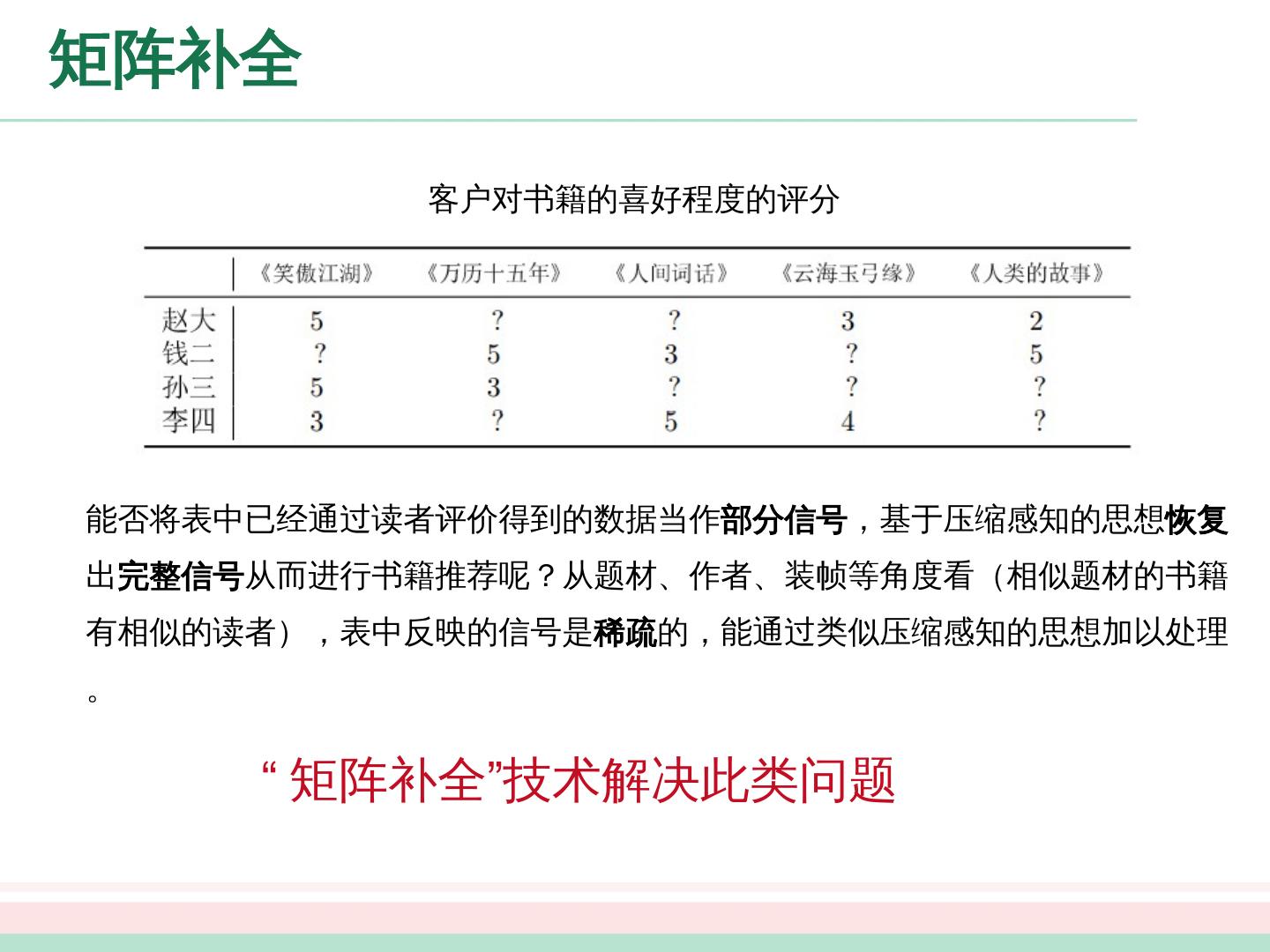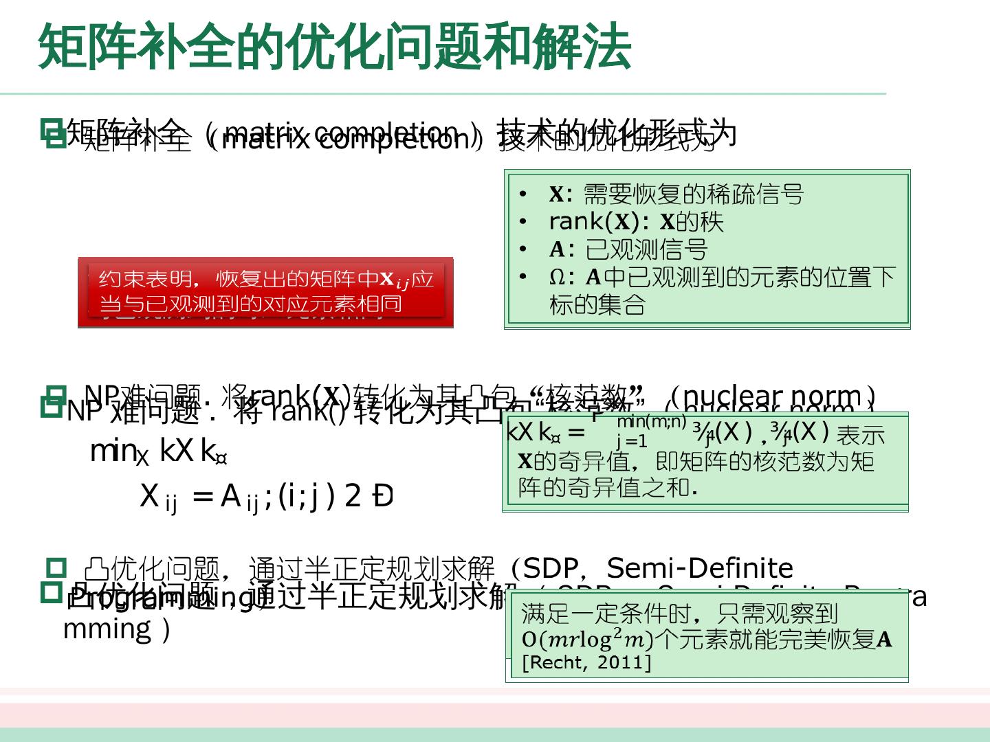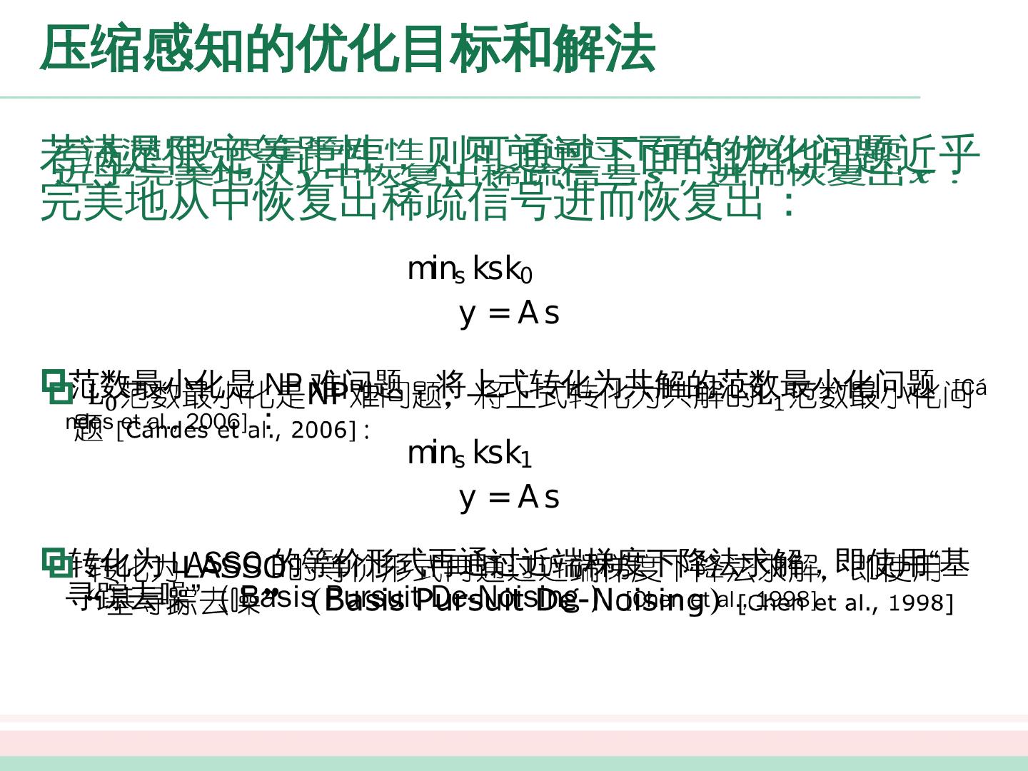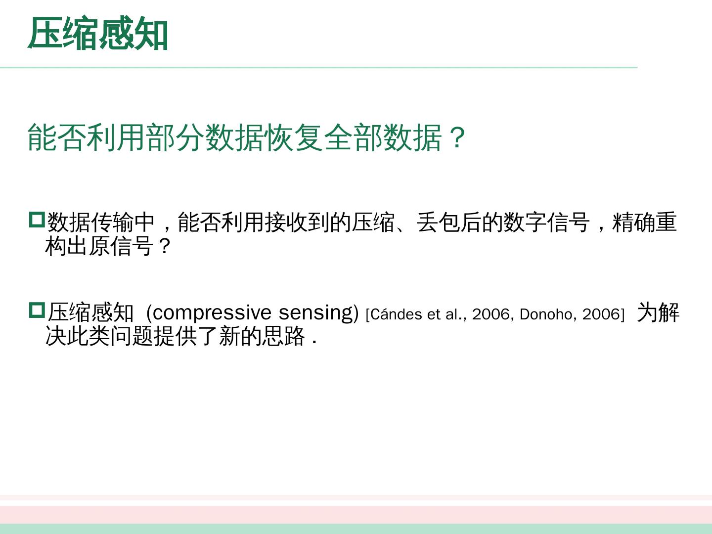 27 .压缩感知 数据传输中,能否利用接收到的压缩、丢包后的数字信号,精确重构出原信号? 压缩 感知 (compressive sensing ) [ Cándes et al., 2006, Donoho , 2006] 为解决 此类 问题提供了新的思路 . 能否利用部分数据恢复全部数据?