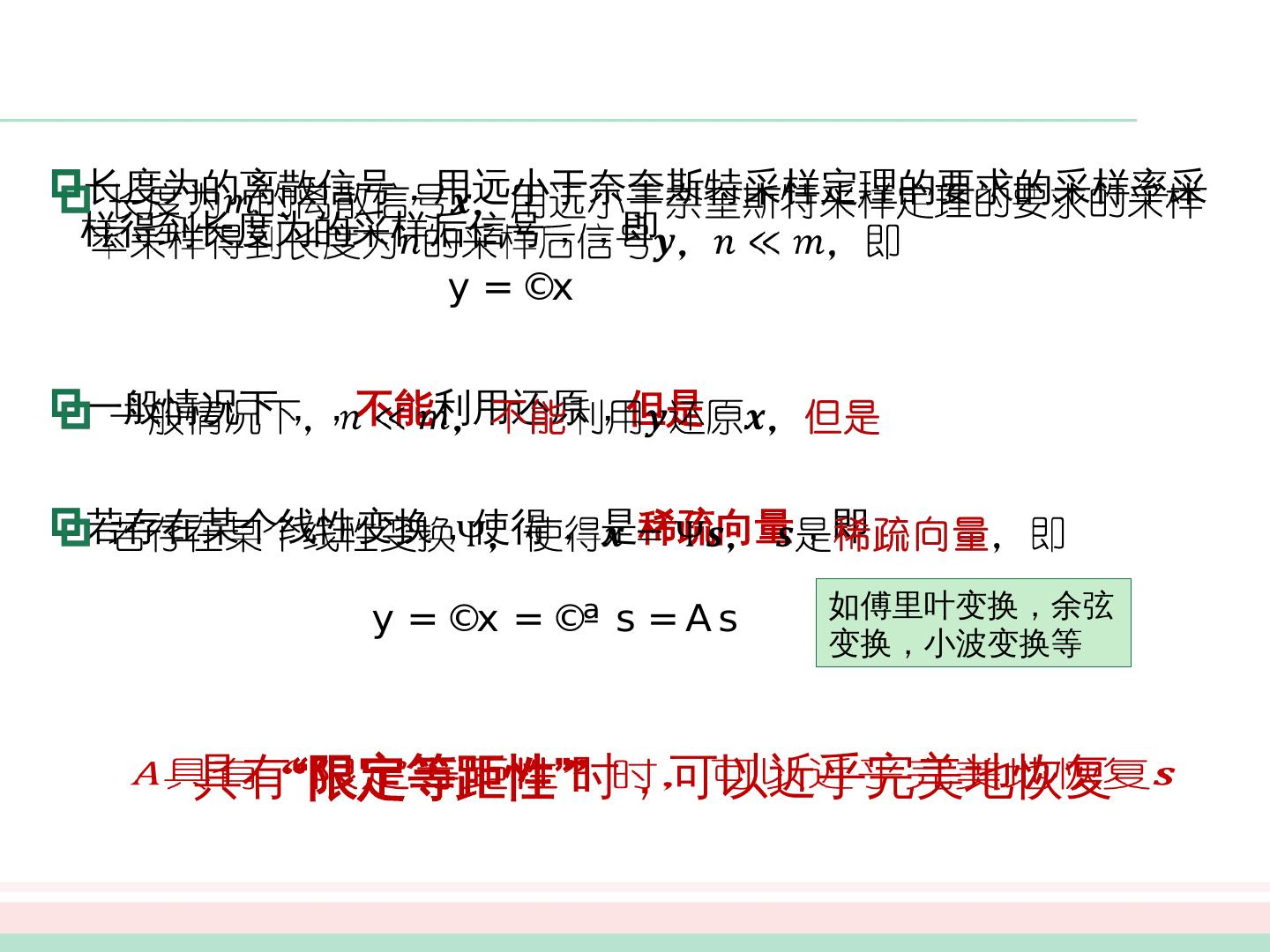 28 .长度为 的离散信号 ,用远小于奈奎斯特采样定理的要求的采样率采样得到长度为 的采样后信号 , ,即 一般情况下, , 不能 利用 还原 , 但是 若存在某个线性变换 ,使得 , 是 稀疏向量 ,即 具有 “限定等距性” 时,可以近乎完美地恢复 如傅里叶变换,余弦变换,小波变换等